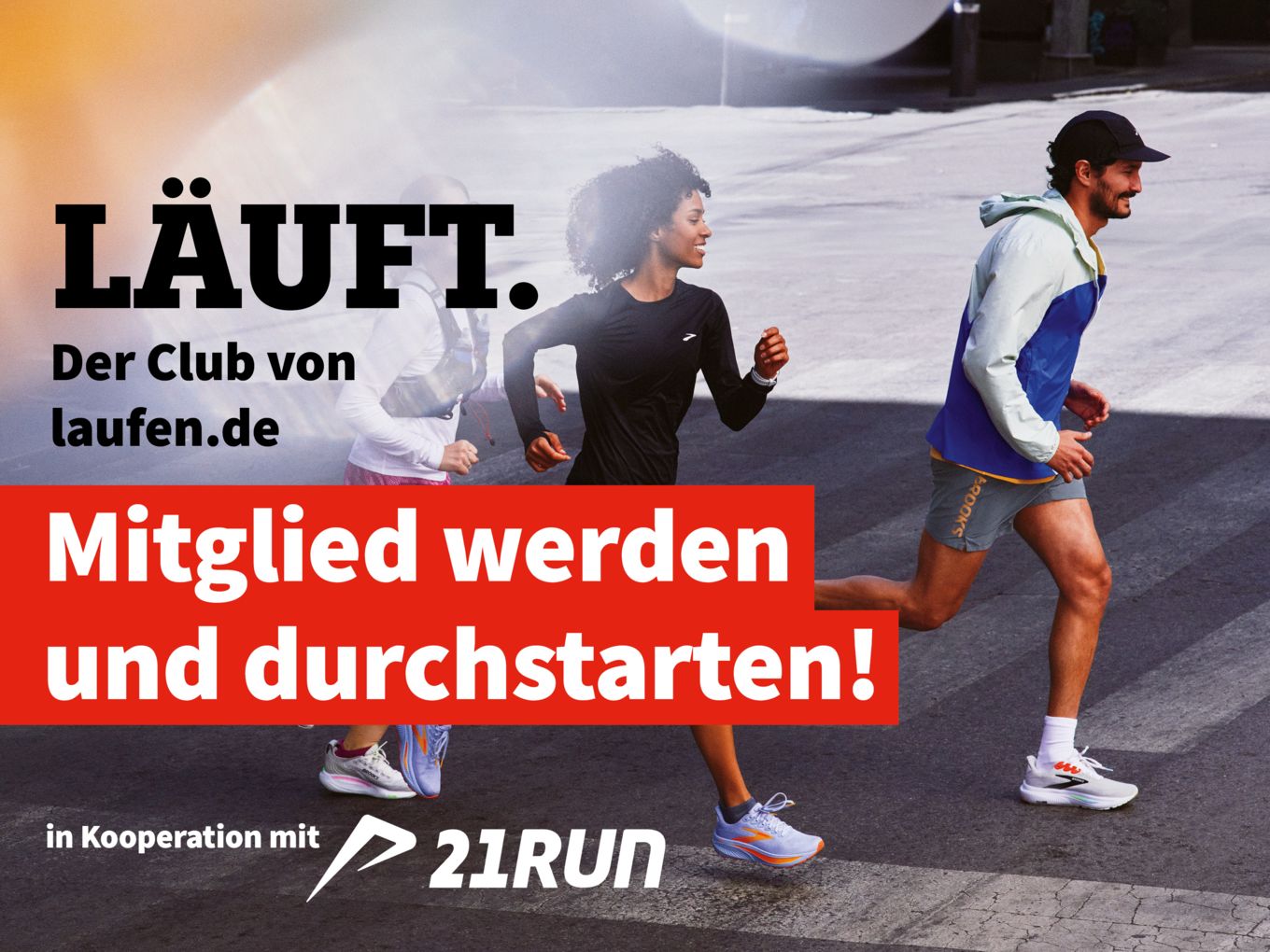 Du liebst das Laufen – oder möchtest endlich damit starten? Dann ist LÄUFT. – der Club von laufen.de genau das Richtige für dich! Mit täglich neuer Inspiration rund um dein gesundes Hobby auf laufen.de. Mit bewährten Trainingsplänen für den Einstieg und alle wichtigen Laufstrecken. Mit vergünstigten Startplätzen bei vielen Laufevents und individuellen Experten-Tipps unseres laufen.de-Teams. Und mit dem Gratis-Zugriff auf das große Fitness-Laufbuch von Sabrina Mockenhaupt und auf alle Magazine von laufen.de. Und das alles für nur 24,90 Euro im Jahr!