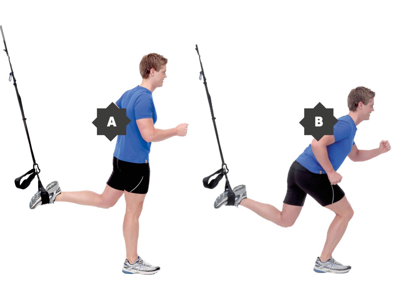 Stelle dich mit dem Rücken zum Schlingentrainer. Lege dann einen Fußrücken in den Griff (A). Wenn du sicher stehst, gehe langsam in die Kniebeuge und führe die Arme gegengleich mit. Dabei sollte das Knie nicht über die Fußspitze hinaus bewegt werden (B). Danach in die Ausgangsstellung zurückkehren. Übung wiederholen und das Bein wechseln.