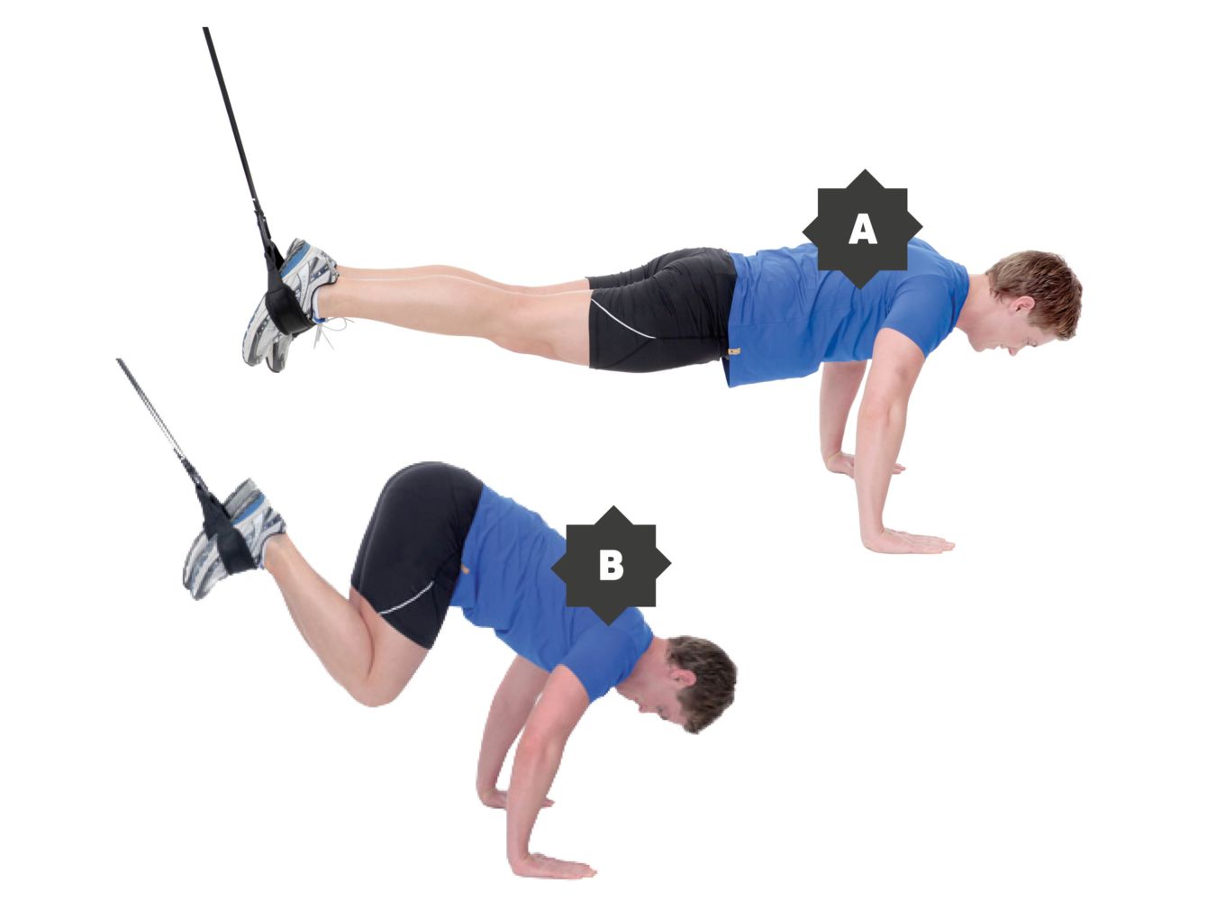 Knie dich mit dem Rücken zum Schlingentrainer und lege die Fußrücken nacheinander in die Griffe, sodass du dich in einer Liegestützposition befindest. Halte diese Position stabil (A). Ziehe nun beide Knie in Richtung Ellbogen (B) und komme danach in die Ausgangsposition zurück.