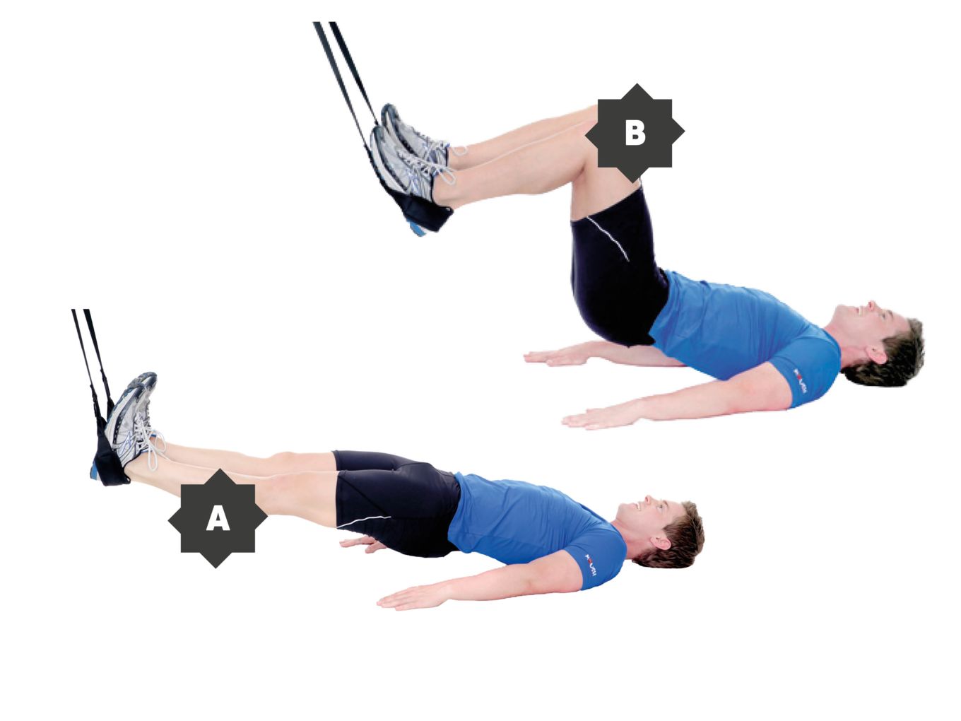 Setze dich vor dem Schlingentrainer auf den Boden und lege die Fersen nacheinander in die Griffe. Lege dich dann lang hin, hebe das Gesäß an und halte diese Position stabil (A). Winkele die Unterschenkel dann etwa 90 Grad an (Knie Richtung Decke ziehen), während der Oberkörper in Position bleibt (B). Diese Position halten und dann in die Ausgangsposition zurückkehren.