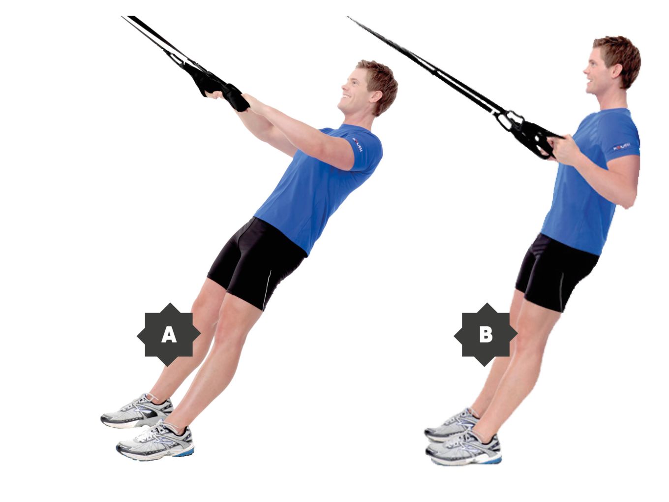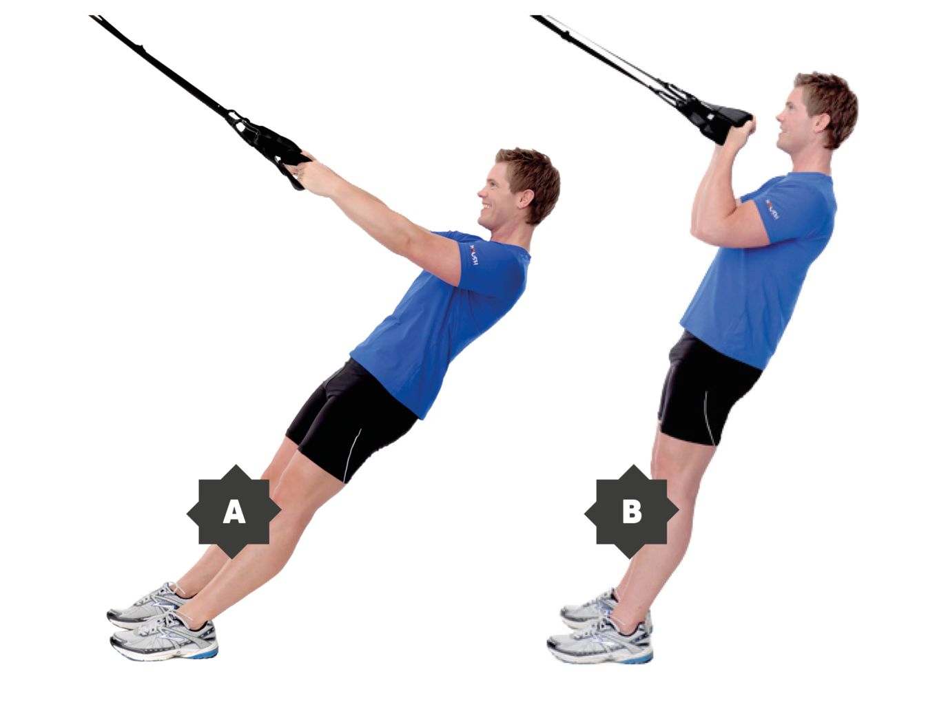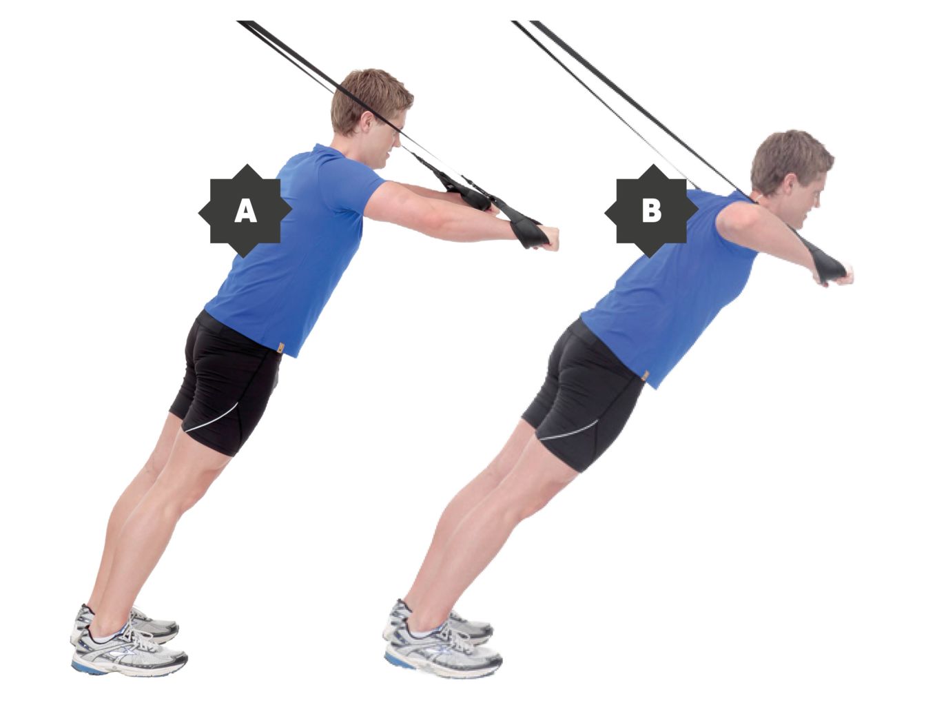 Stelle dich mit dem Rücken zum Schlingentrainer, deine Füße stehen schulterbreit parallel nebeneinander. Greife beide Griffe einzeln vor dem Körper (Handrücken zeigen nach oben). Die Arme sind im Ellbogen leicht gebeugt, der Oberkörper weist nur eine leichte Schräglage auf (A). Beuge nun die Arme (Ellbogen ziehen nach hinten-oben) und senke den Körper nach vorne ab (B).