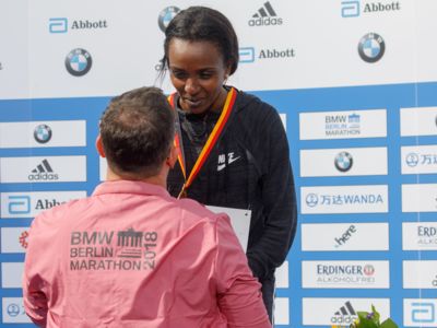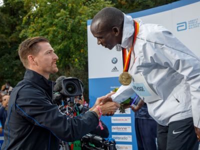Doch der Ausnahmeläufer wurde nach dem Ausscheiden des letzten Tempomachers nicht etwa langsamer sondern schneller! Die zweite Hälfte rannte er in sensationellen 60:33 Minuten. Zum Vergleich: der deutsche Halbmarathon-Rekord steht bei 60:34. „Es war mein Ziel, den Weltrekord deutlich zu unterbieten und ich war zuversichtlich vor dem Rennen. Ich bin 2:04 und 2:03 gelaufen und heute nun 2:01 - wer weiß, was die Zukunft bringt“, sagte Eliud Kipchoge, der in Berlin 2015 und 2017 den Weltrekord jeweils verpasst hatte, weil er Pech hatte. 2015 hatte er Schuhprobleme, im vergangenen Jahr stoppte ihn der Regen. Trotzdem gewann er beide Rennen und siegte somit heute zum dritten Mal in Berlin. „Ich will auf jeden Fall nach Berlin zurückkommen. Berlin ist für mich - für ewig“, erklärte Eliud Kipchoge, der nun elf seiner zwölf Marathonläufe gewonnen hat und endlich auch den Weltrekord in seinem Besitz hat.