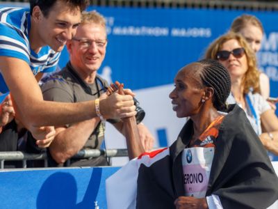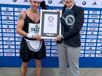 Und neben dem Weltrekord von Eliud Kipchoge wurden im Rahmen des 45. Berlin-Marathons noch vier weitere Weltrekorde erzielt: Von Läufern und Skatern in ganz speziellen. Kostümen. Vier von denen wurden direkt vor Ort von der der offiziellen Guinness World Records Rekordrichterin Lena Kuhlmann bestätigt: Den aufregendsten und nervenaufreibendsten Rekord erzielte Jamie Buckland aus Großbritannien. Verkleidet als französisches Mädchen unterbot er den früheren Rekord Stunden zuvor beim Sydney-Marathon aufgestellt wurde, um fast acht Minuten. Mit einer Zeit von 3:02:56 Stunden ist er nun Rekordhalter in der Kategorie „French Maid“ für Männer.