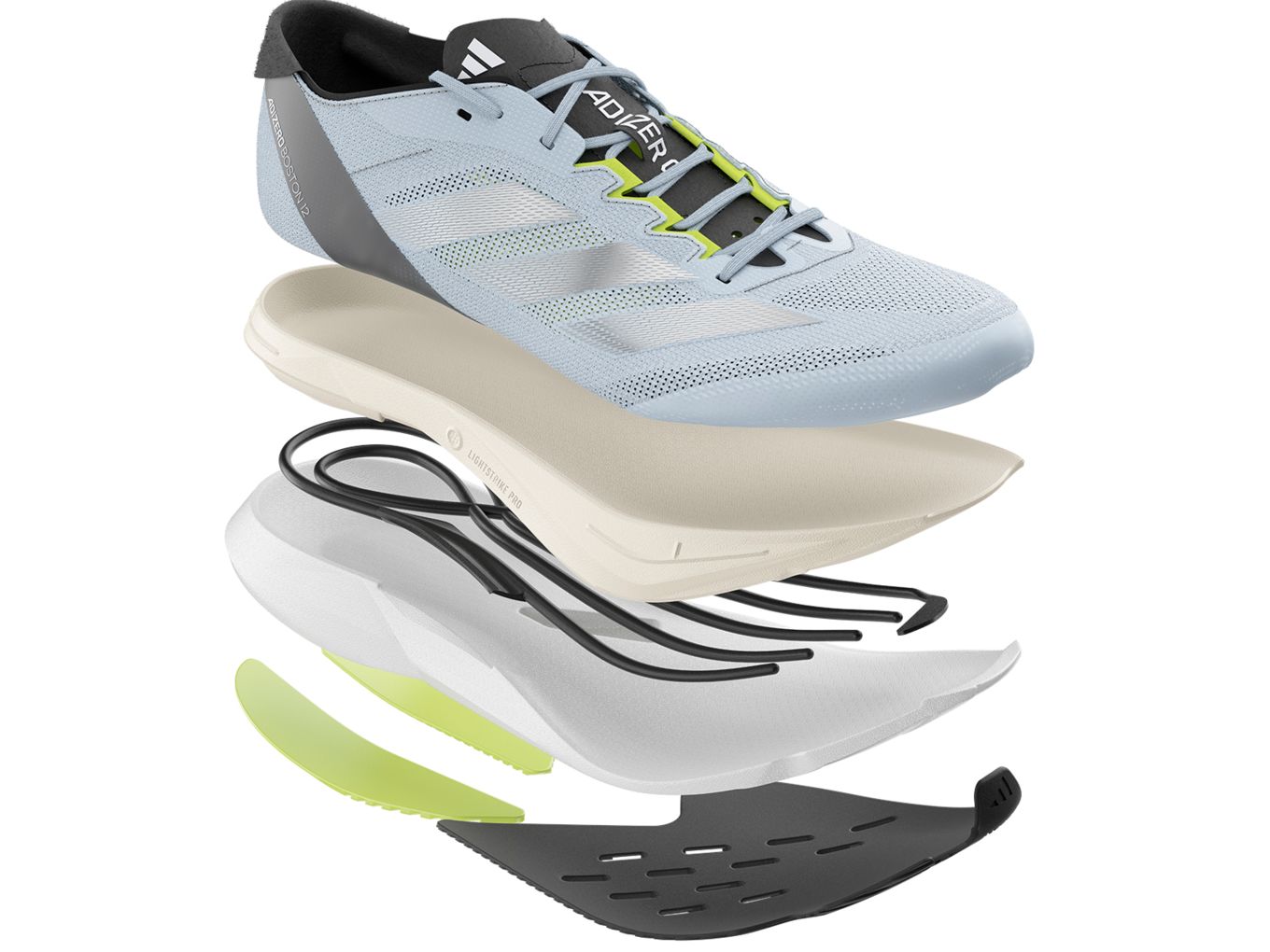 Wie in der elften Version besteht auch jetzt die Mittelsohle aus zwei Lagen Dämpfungsmaterial. Die obere ist unverändert aus Lightstrike Pro. Es ist das leichteste, reaktionsfreudigste und auch komfortabelste Schaumstoffmaterial von Adidas. In der unteren Lage wird nun Lightstrike 2.0 statt Lightstrike verwendet. Lightstrike 2.0 ist noch leichter – und das, obwohl die Dichte des Materials nicht verändert wurde. Wie die Vorgängervariante Lightstrike sorgt der EVA-Schaum für Langlebigkeit und Stabilität.