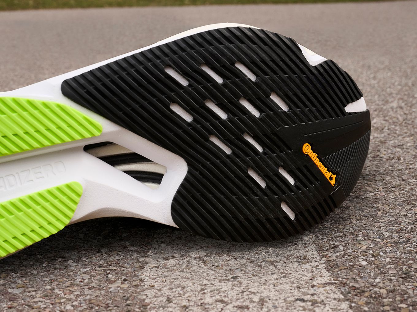 Neu ist auch die Außensohlesohle, die zwar immer noch über einen Continental-Gummimischung verfügt. Diese geht aber nicht mehr über die komplette Länge der Sohle. Durch die Analyse von Laufdaten vieler Läuferinnen und Läufer wurden Zonen ermittelt, wo keine Gummiaußensohle benötigt wird, ohne dass der Grip darunter leidet. Hier wurde auf die Continental-Außensohle verzichtet und weiteres Gewicht eingespart.
