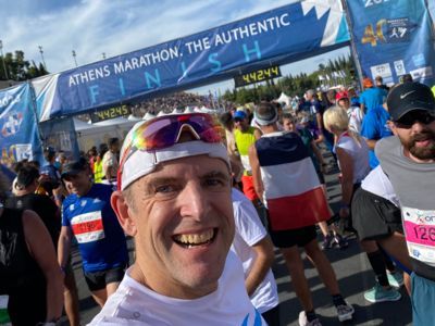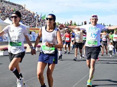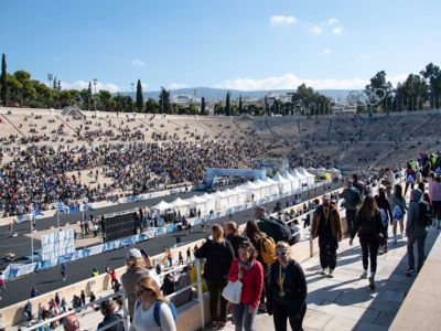 Mit allen Begleitpersonen schlagen wir unser Lager an der Strecke auf und feuern die Läufer:innen an, ehe wir alle Finisher im wunderschönen Panathinaiko-Stadion im Ziel empfangen.