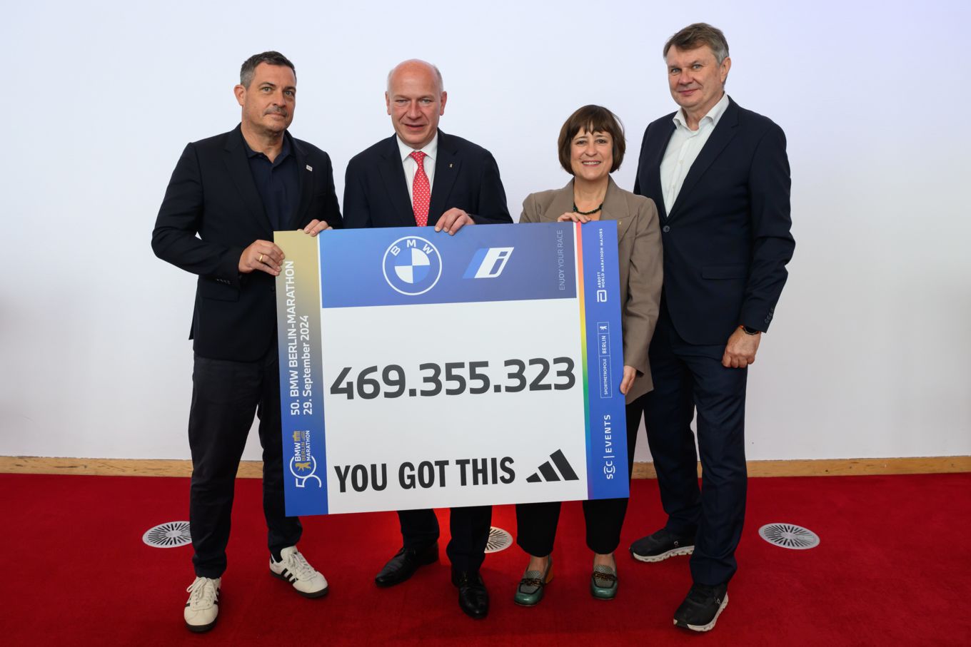 Jürgen Lock, Geschäftsführer von SCC Events; der Regierende Bürgermeister von Berlin, Kai Wegner; die Staatssekretärin Franziska Becker und Burkhard Kieker, Geschäftsführer von visitBerlin präsentierten bei einer Pressekonferenz die Zahl von fast einer halben Milliarde Euro, die der Berlin-Marathon in die Hauptstadt bringt.