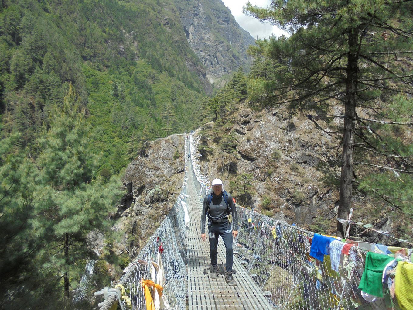 Die letzten fünf Tage Fußmarsch führten über die Marathonstrecke, die nach dem Start an einem Novembermorgen bei -22° Celsius über Gletscher, Geröllhalden, Singletrails, Wildwasserflüsse und wackelige Hängebrücken, zwar überwiegend abwärts, aber nicht ohne einige brutale Gegenanstiege, ins 3446 Meter hohe Namche Bazar führte.