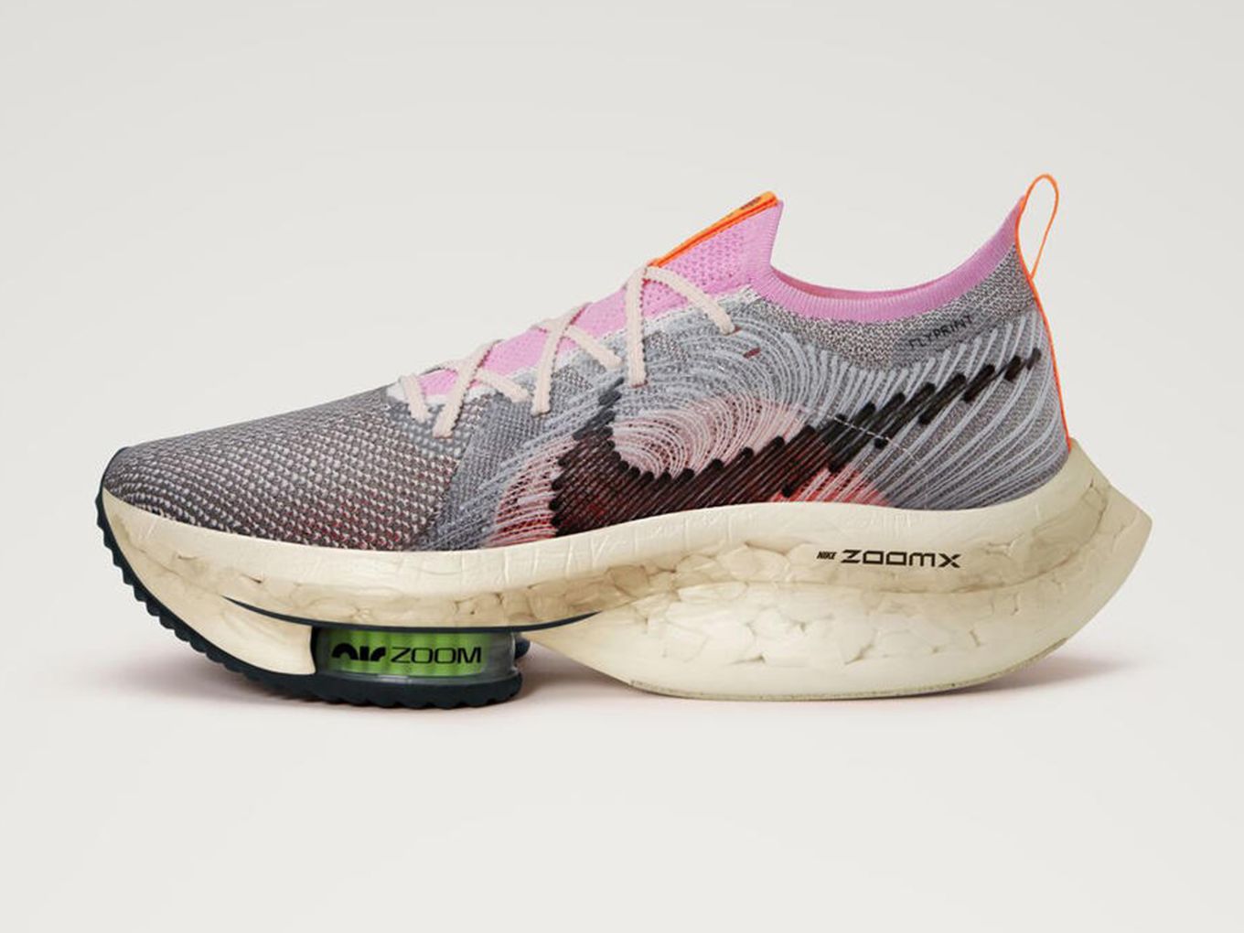 70 Prozent der Mittelsohle des Alphafly Next Nature besteht aus recyceltem Material, das aus alten Schuhen gewonnen wurde. Dazu zählt der ZoomX-Schaum und die Carbonplatte – sie wird aus Kohlenstoff gefertigt, der zuvor bereits in anderen Laufschuhen im Einsatz war. „Damit erreicht der Alphafly Next Nature jene Laufeigenschaften, die ihn zu einem echten Alphafly machen“, sagt Elliot Heath. Die Air-Pods, die für die Vorfußdämpfung sorgen, unterscheiden sich indes nicht von denen des herkömmlichen Alphaflys. Sie werden schon lange zum Großteil aus recycelten Materialien hergestellt. Der Alphafly Next Nature hebt dieses Prinzip aber noch mal auf ein neues Level: Was von alten Air Pods übrig bleibt, wird für sein Obermaterial genutzt. Mithilfe der 3D-Druck-Technologie entsteht so aus Abfall ein Obermaterial, das eine Mischung aus Nikes Flyprint and Flyknit darstellt.