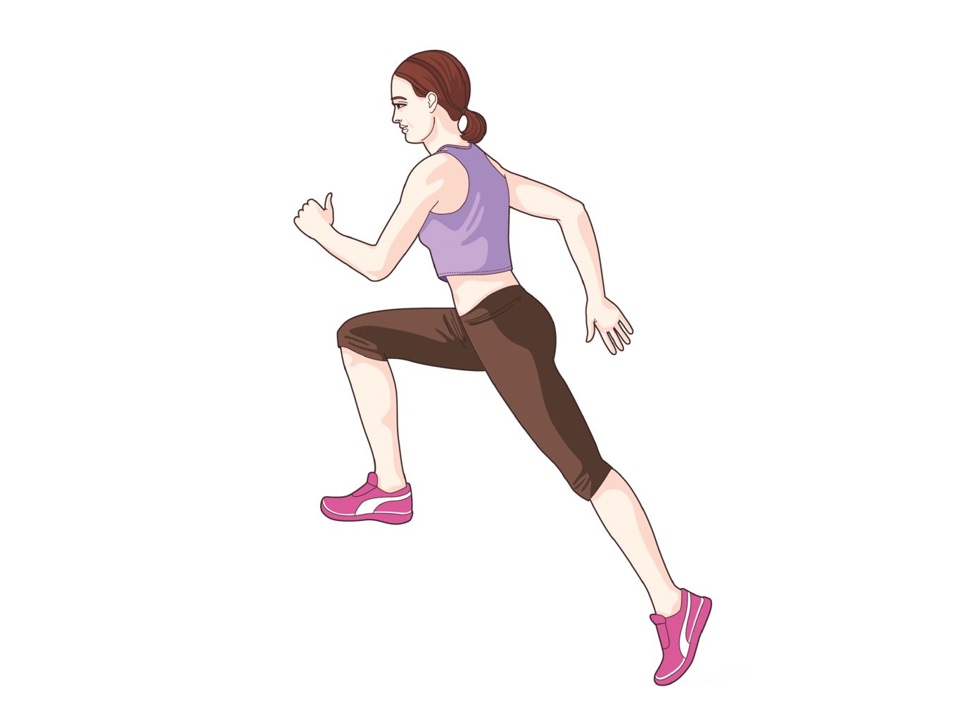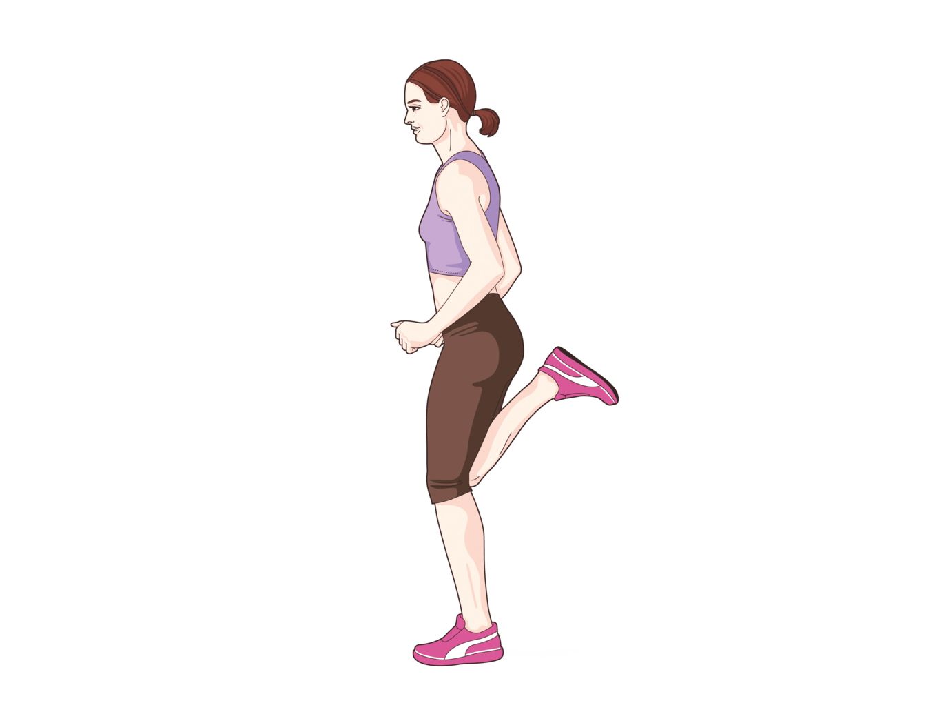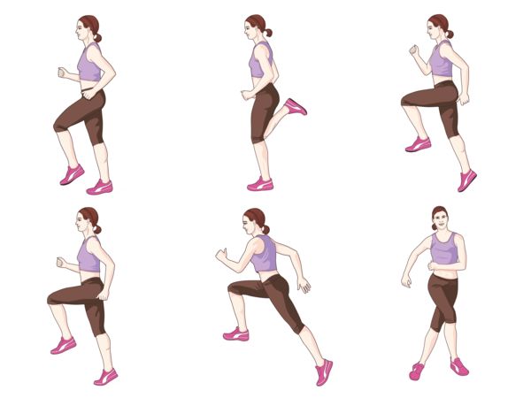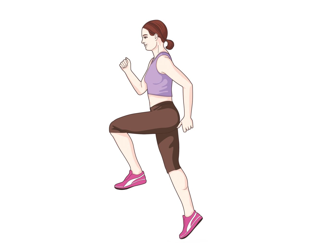 Der Kniehebelauf unterscheidet sich von den Skippings hauptsächlich durch einen höheren Kniehub. Der Oberschenkel des Schwungbeins kommt dabei bis in die Waagerechte. Du bewegst dich auf dem Vorfuß. Achte auf Fuß-, Knie- und Hüftstreckung. Auch hier kannst du die Schrittfrequenz variieren. Allerdings ist eine technisch saubere Durchführung immer wichtiger als die Höhe der Frequenz. Die Arme unterstützen die leichte Vorwärtsbewegung.