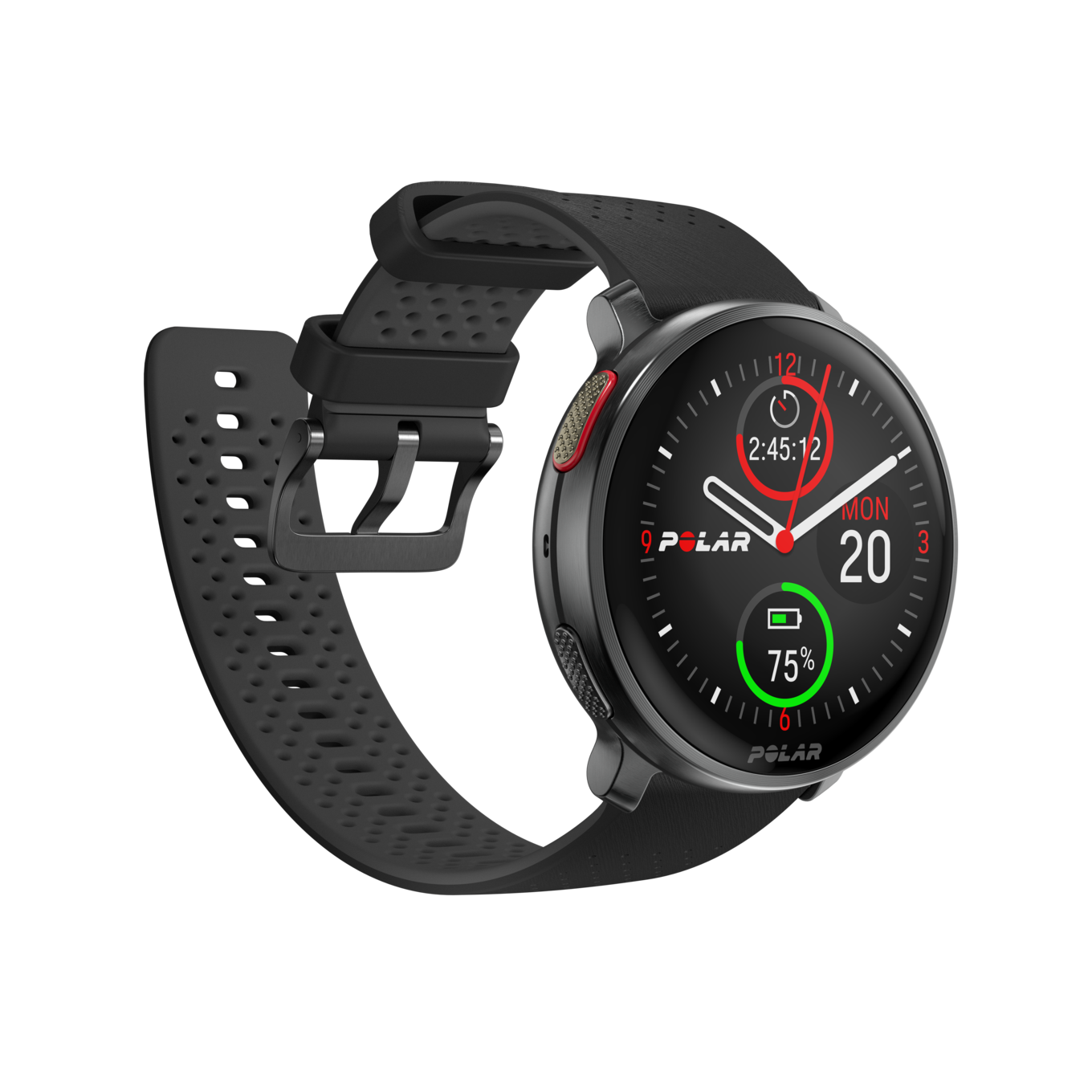 Das hochauflösende Amoled-Touchscreen-Display erzeugt ein gestochen scharfes Bild. Das Zweifrequenz-GPS -System misst Entfernungen selbst bei Störfaktoren wie Gebäuden oder schlechtem Wetter absolut präzise. Hinzu kommen die Offline-Karten-Funktion und der leistungsstärkste Prozessor, der bislang in einer Polar-Uhr verbaut wurde. Funktionen wie Track-Back, Turn-by-Turn-Guidance powered by komoot und Hill Splitter ermöglichen es, überall mit der Vantage V3 zu trainieren. Trotz des größeren und helleren Displays und der zahlreichen Funktionsverbesserungen bietet die Vantage V3 eine Akkulaufzeit von mehreren Tagen. Mit einer vollen Akkuladung kann der Benutzer im Energiesparmodus bis zu 140 Stunden trainieren und bis zu acht Tage lang das Display nutzen.