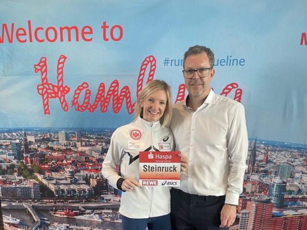 Kenias Titelverteidiger Bernard Koech und die äthiopische Marathon-Weltmeisterin von 2022, Gotytom Gebreslase, führen die hochklassigen Elitefelder beim Haspa Marathon Hamburg an. Koech siegte vor einem Jahr mit einem Streckenrekord von 2:04:09 und stellte damit seine persönliche Bestzeit ein. Gebreslase, die sich noch für die Olympischen Spiele im Sommer in Paris qualifizieren möchte, hat bisher eine Zeit von 2:18:11 erreicht. Mit dem Ziel Olympia in Paris wird kurzfristig auch die holländische EM-Dritte von München 2022, Nienke Brinkman, in Hamburg starten. Mit Katharina Steinruck (Eintracht Frankfurt/2:24:56; auf unserem Bild mit Renndirektor Frank Thaleiser), Rabea Schöneborn (SCC Berlin/2:27:03); Kristina Hendel (LG Braunschweig/2:27:29); Sebastian Hendel (LG Braunschweig/Bestzeit: 2:10:14) und Tom Gröschel (TC Fiko Rostock/2:11:02), ist auch eine Gruppe von deutschen Topathleten am Start.