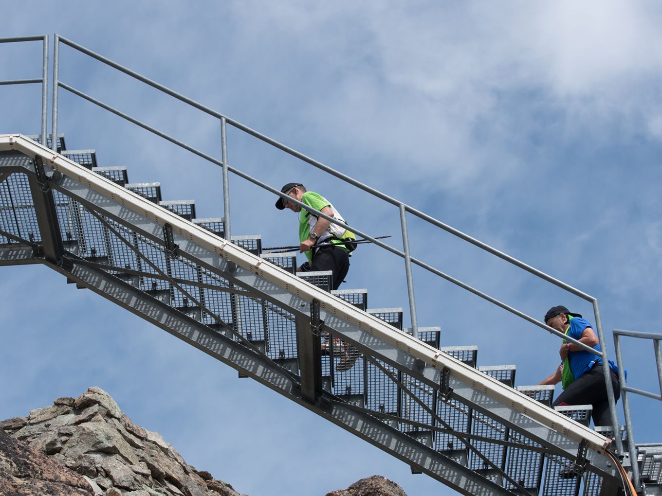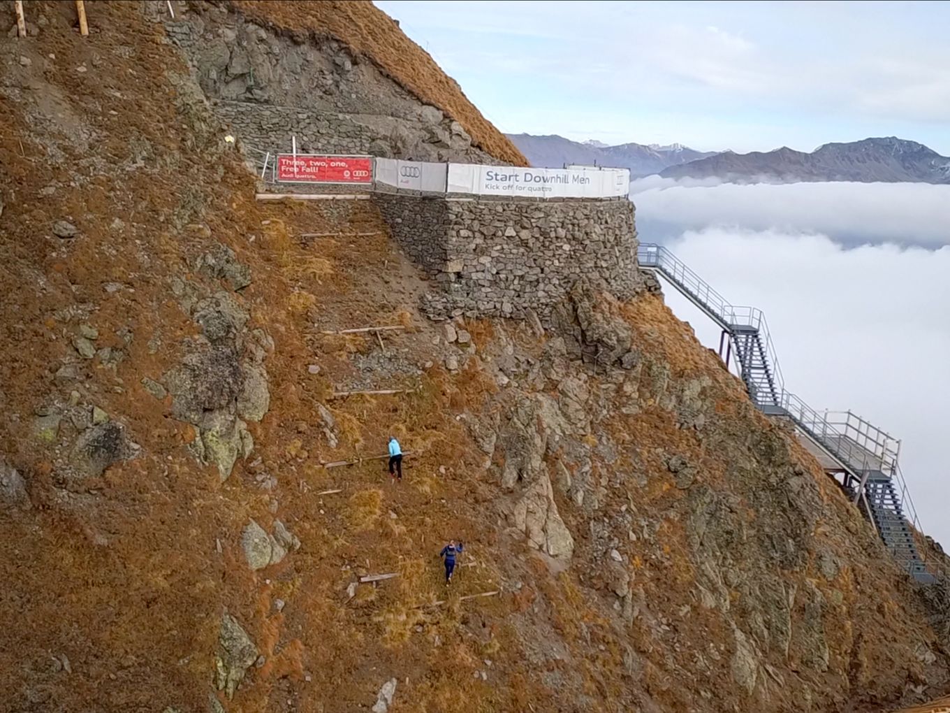 Den Abschluss des Rennens machte der legendäre Starthang, der sogenannte Freie Fall mit 45 Prozent Neigung. Dort, in 2840 Metern über Null, wo sich im Winter die Rennfahrer aus dem Starthäuschen auf die Piste stürzen und in Nullkommanichts eine Geschwindigkeit von 140 Stundenkilometern erreichen, lag das spektakuläre, hochalpine Ziel.