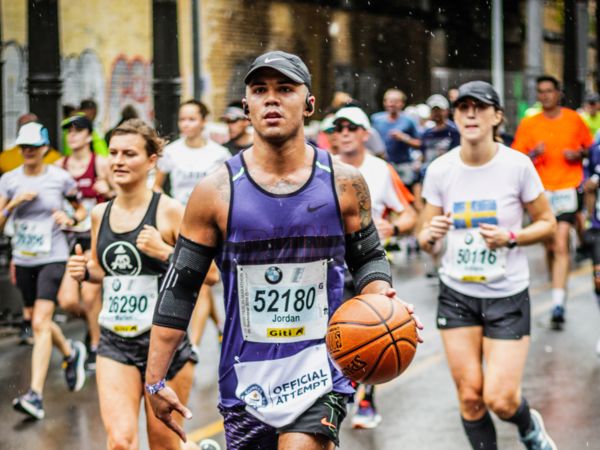 Das Starterfeld ist sehr dicht, doch bereits nach nicht einmal einem Kilometer kann sich Jordan wie auf einem Basketballfeld freilaufen und hat seinen Rhythmus gefunden. Peng, peng, peng. Einen Basketball dribbelt er mit der rechten, einen weiteren mit der linken Hand. Es ist eine koordinative Herausforderung, die es dabei zu bewältigen gilt: Die Bälle dribbeln, sich aber auch auf die Strecke konzentrieren und möglichen Hindernissen ausweichen.