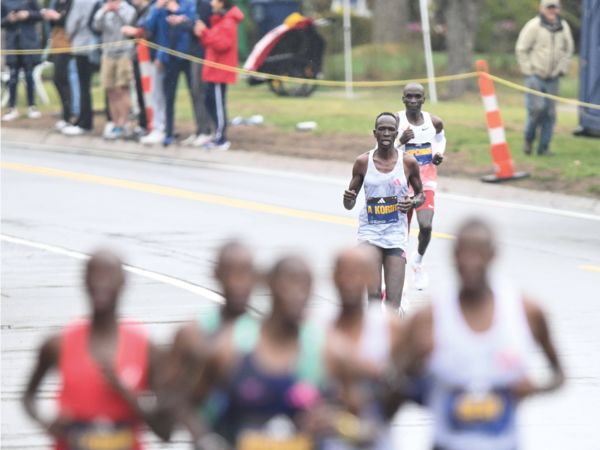Bei 12 bis 14 Grad Celsius und mal schwächerem und mal stärkeren Regen kontrollierte Eliud Kipchoge das Feld lange Zeit von der Spitze des ältesten Marathons der Welt an. Bei der Halbmarathon-Marke und dem 30-km-Punkt führte der 38-Jährige eine siebenköpfige Gruppe mit Zwischenzeiten von 62:19 Minuten beziehungsweise 1:29:23 Stunden an. Kenias zweifacher Marathon-Olympiasieger und Weltrekordler (2:01:09 Stunden in Berlin 2022), der in Wien 2019 in einem nicht rekord-konformen Rennen mit 1:59:40,2 die Zwei-Stunden-Barriere durchbrach, blieb dann jedoch in den Hügeln von Boston regelrecht stecken.