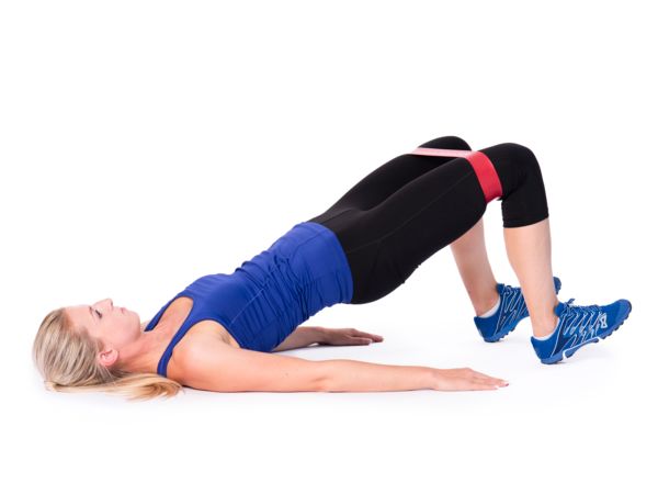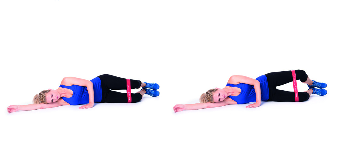 Begebe dich in die Seitlage, platziere das Band oberhalb der leicht gebeugten Knie. Die Füße liegen aufeinander. Die Knie nun langsam gegen den Bandwiderstand öffnen und wieder schließen ohne dass sich die Füße voneinander lösen. Seite wechseln.