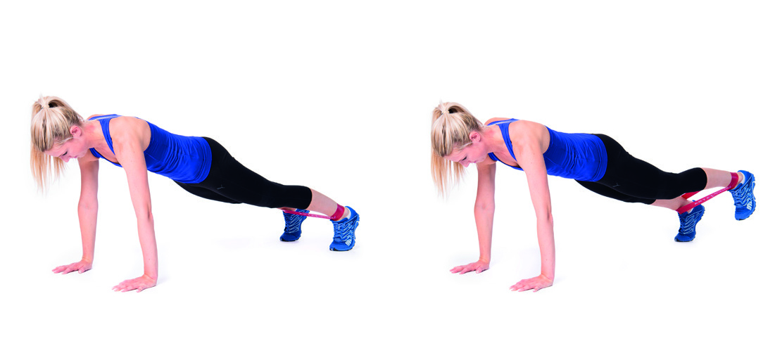 Gehe in die Liegestützposition und platziere das Band oberhalb der Fußgelenke. Nun abwechselnd einen Fuß vom Boden lösen, gegen den Widerstand anheben und wieder absetzen.