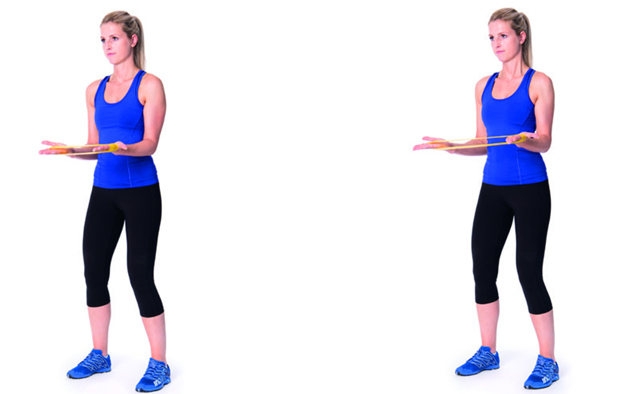 Nehme einen hüftbreiten Stand ein. Lege das Rubberband um die Hände (Daumen frei, Handflächen zeigen nach oben). Während die Ellbogen eng am Körper bleiben, werden die Unterarme nach außen rotiert. Langsam zurück und erneut beginnen. Dabei das Band immer auf Spannung halten.