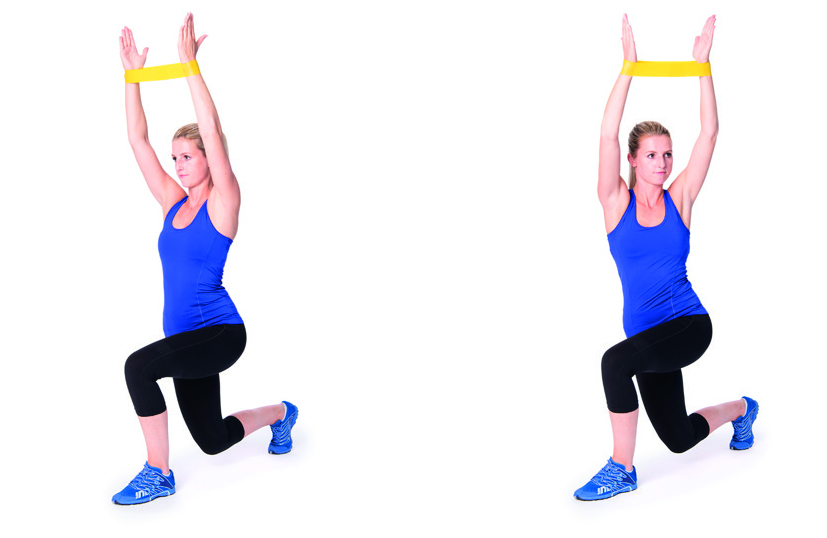 Begebe dich in eine Schrittstellung, bei der die Füße mehr als schulterbreit voneinander entfernt sind. Das hintere Knie nun am Boden ablegen. Mit dem gespannten Band um die Handgelenke gelegt, den Oberkörper langsam nach links und rechts drehen. Der Kopf bleibt zwischen den Armen, der Blick geht mit.