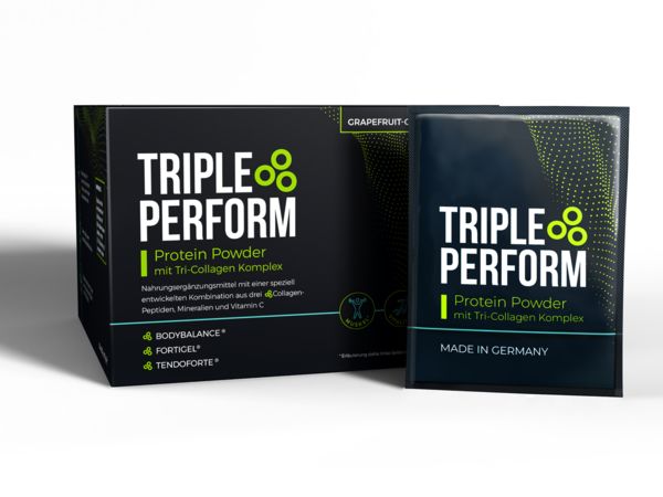 Triple Perform ist ein Proteinpulver mit den drei verschiedenen bioaktiven Kollagen-Peptiden Bodybalance, Fortigel und und Tendoforte, die vom Hersteller Atro Pro Vita entwickelt worden sind, um den Muskelaufbau zu unterstützen und um Sehnen, Bänder und Gelenke zu stärken. Die Kollagen-Peptide führen zu nachweislich optimalen stimulierenden Zelleffekten für spezifische gesundheitliche Vorteile und sind außerdem hoch verdaulich, allergenfrei und gut verträglich. Hinzu kommen Zink, Magnesium und Vitamin C, das die Kollagen-Neubildung unterstützt und somit auch die stabile Funktion von Knorpel und Knochen.