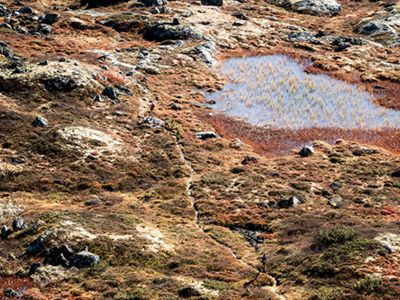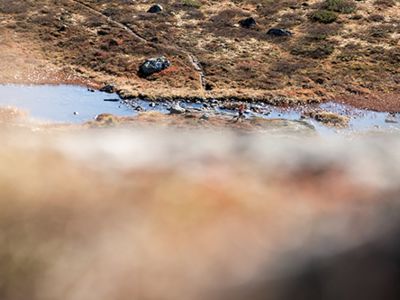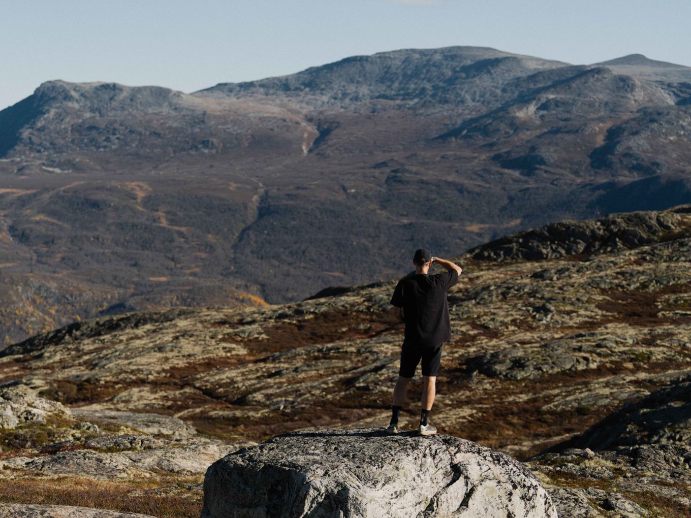 Nach dem ersten Anstieg ist die wilde Graslandschaft rund um den höchsten Punkt Hemsedals erreicht. Mit seinen 1497 Metern über dem Meeresspiegel, verwandelt sich der stattliche Mount Totten in der kalten Jahreszeit in die höchste Winterskipiste Nordeuropas. Im Herbst allerdings spiegeln sich die orange-roten Büsche und der strahlend blaue Himmel in den kleinen Seen am Fuße des Gipfels. Schier endlos erstreckt sich die Moor- und Graslandschaft vor meinen Laufschuhen, wenn ich es, denn schaffe den Blick lang genug zu heben. Denn zu Beginn des Trails kleben meine Augen regelrecht an dem Fleckchen Boden direkt vor mir. Die Erfahrung erinnert mich schmerzlich an meine ersten Fahrstunden, in denen ich die Augen kaum von der Motorhaube heben konnte. Der „weite Blick“ ist eine Fähigkeit, die für den Trail erlernt werden muss, um in doppelter Hinsicht vorrausschauend und eben auch sicher unterwegs zu sein. Besonders auf diesem neun Kilometer langen Teilstück, das von Geröll, Wurzeln, Pfützen und Bächen geprägt ist, muss ich mich langsam daran gewöhnen, den Blick weiter nach vorn zu richten.