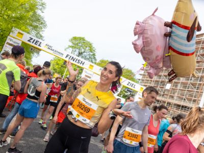 Im Mai 2023 stellte sie schließlich eine WhatsApp-Gruppe namens „Berlin-Marathon“ auf die Beine mit 233 Personen und dem Ziel, gemeinsam den Berlin-Marathon zu laufen. „Das war schon eine eigene kleine Community, in der auch Freundschaften entstanden und der man sich auch über persönliche Dinge austauschen kann“, berichtet Annette Vogt, die als Annette Schweinehund in der Lauf-Szene bekannt ist. Es folgten gemeinsame Starts und die Idee, ein neongelbes Laufshirt mit dem pinken Aufdruck „Die Schweinehunde“ zu schaffen. Um Teammitglieder aber auch aus weiter Entfernung noch besser zu identifizieren, kamen ein aufblasbarer Dackel, namens Muffin, und ein aufblasbares Schwein, das Marianne getauft wurde, hinzu. „Mittlerweile gibt es sogar einige, die sich Muffin und Marianne haben tätowieren lassen. Damit ist das Ding natürlich komplett eskaliert“, sagt Annette Vogt.