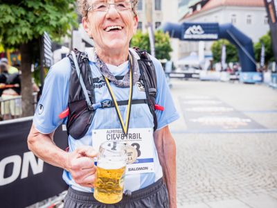 Und für alle, die sich wegen deren Spruch zur Gefahr auf den Trails am Hochstaufen, vielleicht noch nicht so richtig an die Strecke trauen, hatte Moderator Boris Bregar beim Zieleinlauf vor dem schmucken Rathaus von Bad Reichenhall auch noch eine gute Idee parat: „Lasst uns doch nächstes Jahr noch eine weitere Trailstrecke anbieten: Vielleicht zehn Kilometer mit 400, 500 Höhenmetern und etwas einfacher“, sagte er und erntete vom Rest des Organisationsteam erstmal erstaunte Blicke. Aber das wäre in der Tat eine schöne Ergänzung des Programms, das auch Kinderläufe in der Stadt, einen Citytrail über 5,5 Kilometer und einen Zehn-Kilometer-Straßenlauf umfasst. Zumal in Bad Reichenhall die Felder bei diesem Straßenlauf rückläufig sind, während das Abenteuer Hohenstaufenrun nach 265 im Vorjahr dieses Mal schon 370 Trailrunner anlockte. Insgesamt waren beim Lauftag in der Alpenstadt Bad Reichenhall über 800 Menschen in Bewegung. Der älteste Athlet war der 70-jährige Hans Schinko (TSV 1860 Fanclub Bad Reichenhall-Piding), der jüngste im Feld war Jan Tengler (18 Jahre) aus Eching in Niederbayern.