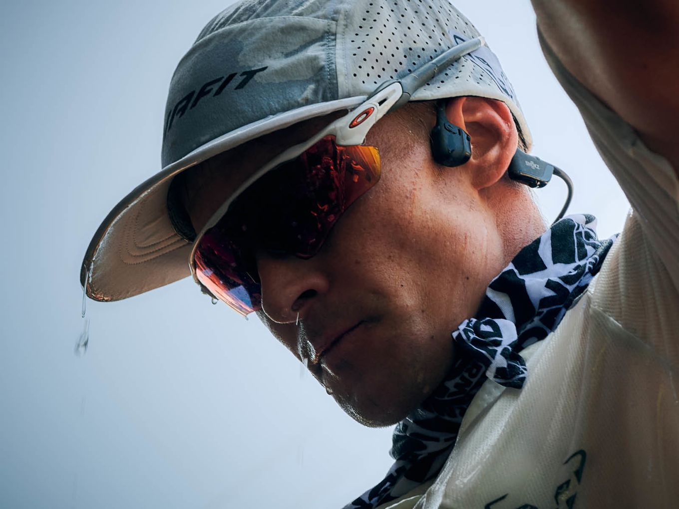 Hannes Namberger: … oft ist das eine Grauzone. Bei vielen Rennen sind Kopfhörer zwar nicht ausdrücklich verboten, klassische In-Ears aber nicht gern gesehen – weil man dann nichts mehr von außen mitbekommt. Bei Shokz ist das im Grunde aber genau andersrum: Du bekommst ja alles mit, weil die Ohren eben frei bleiben. Wenn also jemand um Hilfe ruft oder überholen will, kann ich sofort reagieren. Bei den Rennen habe ich immer Kopfhörer dabei. Am Anfang genieße ich noch die Atmosphäre, aber wenn es später einsam wird oder ich in ein Motivationsloch falle, hilft mir Musik enorm.