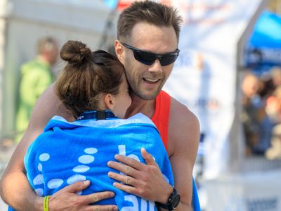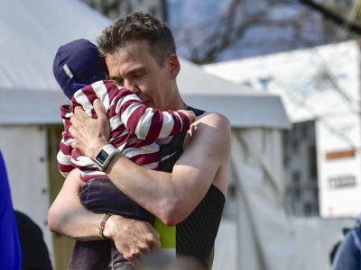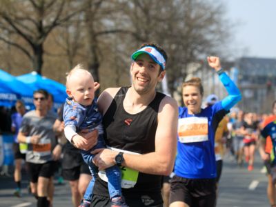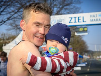 Arne Gabius läuft 2:14:29 und wird im Ziel von Söhnchen Frederik-Bosse erwartet