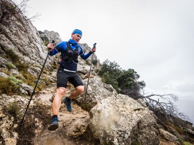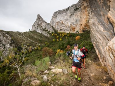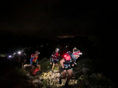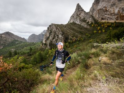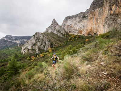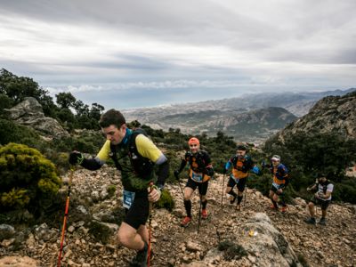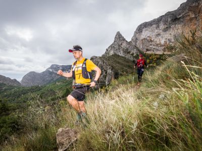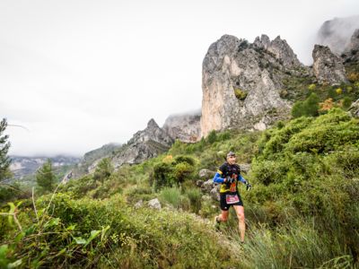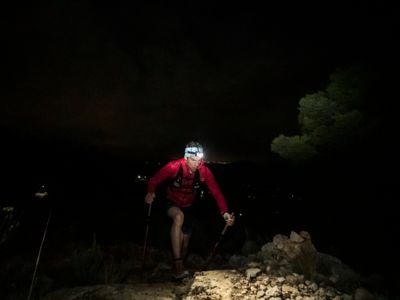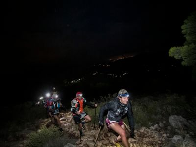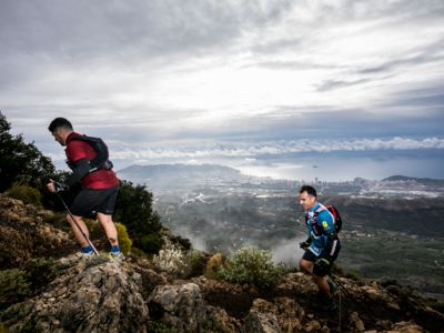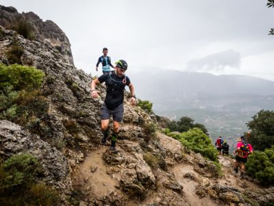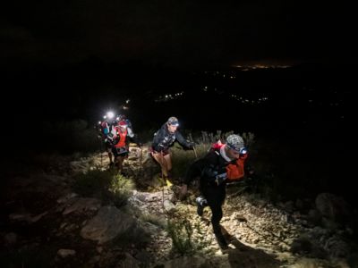 Direkt nach dem Start steht ein fast vertikaler Streckenabschnitt auf dem Programm: Auf nur vier Kilometern führt der Weg von 352 auf 1410 Meter über dem Meer. Der Gipfel des Puig Campana ist der zweithöchste Berg an der Costa Blanca. Seine mächtige Südwand thront über Finestrat. Nach der anspruchsvollen nächtlichen Überschreitung dieses steilen Kalksteinbrockens wird die märchenhaft klare Vollmondnacht von einem Morgen mit Regenwolken abgelöst. Die staubigen Trails verwandeln sich in Schlammrutschbahnen. Für den Läufertross ist das ein zusätzliches Handicap auf dem Weg in die Sierra Aitana, einem kleinen, aber wilden Gebirgszug mit zackigen Felstürmen und zerklüfteten Gipfeln.