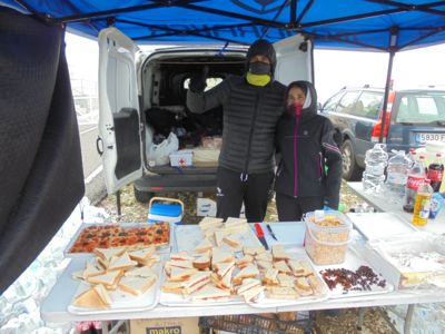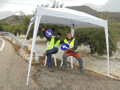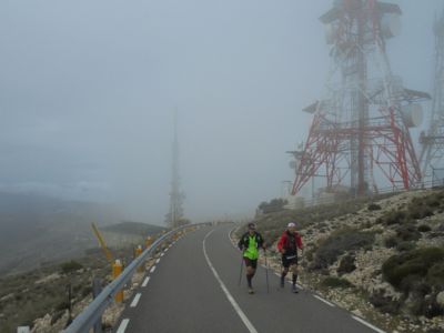 Die militärische Infrastruktur hat allerdings auch Vorteile für den Trail. Eine asphaltierte Straße führt zu der Station. Und diesen Weg haben die Veranstalter des Costa Blanca-Trails genutzt, um feinste Speisen auf den Berg zu karren. So eine genussvolle Oase und so freundliche Helfer erlebt man selten am höchsten Punkt eines Trailruns. Hier verweilt man gern, bevor man sich wieder vom dicken Nebel verschlucken lässt. Denn noch sind 800 felsige Meter bis zum höchsten Punkt zu bewältigen. Dann erst erfolgt der 14 Kilometer lange und steile Downhill über mehr als 1000 Höhenmeter in das Bergdorf Sella, einem lauschigen 600 Seelen Ort.