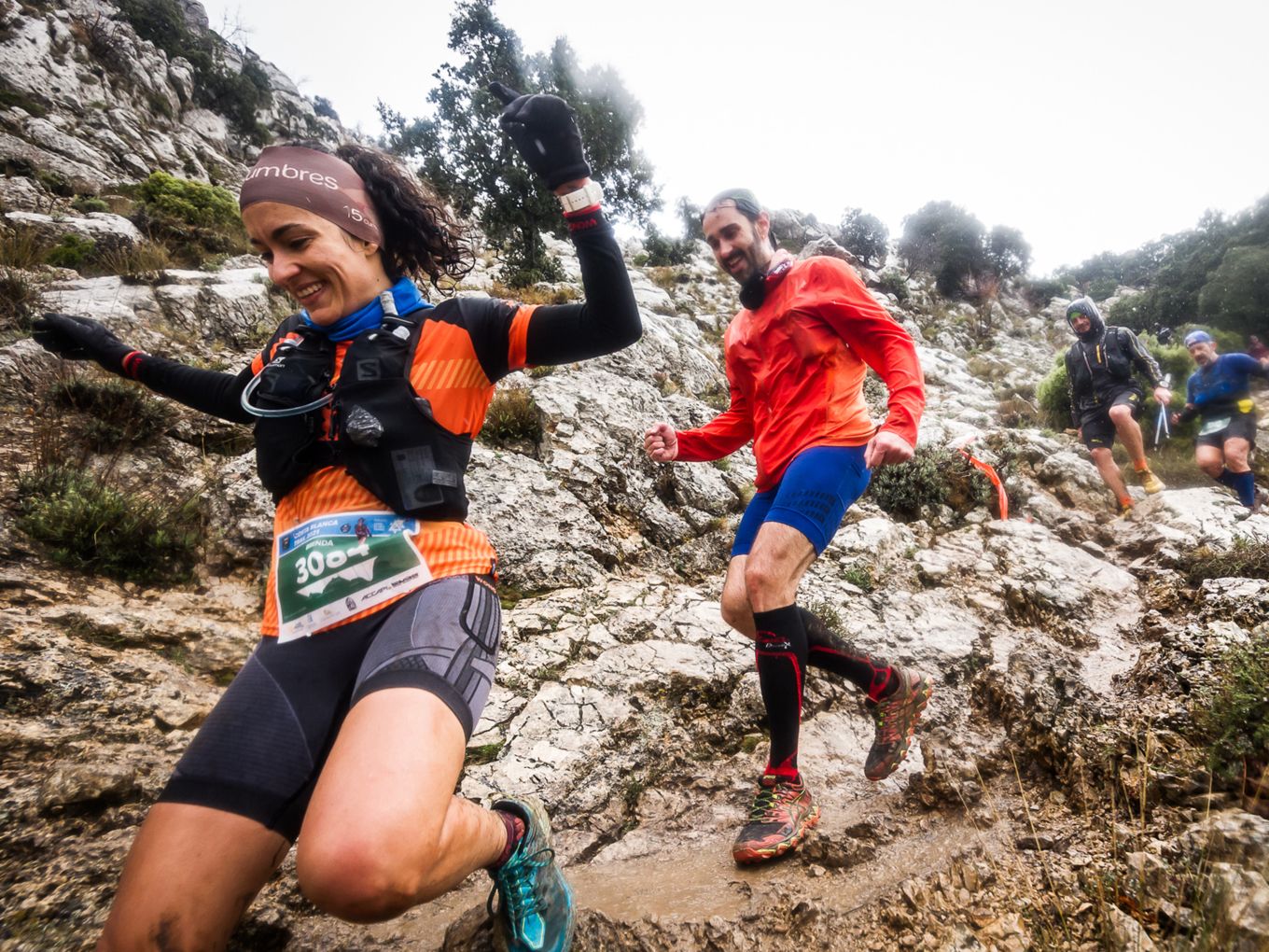 Während die ultralangen Strecken noch in der trockenen Nacht gestartet wurden, gehen die 29 Kilometer am Morgen los, als der Regen die Trails bereits aufgeweicht hat. In den steilen Rinnen der ersten, fast vertikalen Kilometer führt das dazu, dass sich der Läufertross staut: Es ist so rutschig, dass die Steigung von vielen nur auf allen Vieren zu bewältigen ist. Oben angekommen stürmt und regnet es zwar, aber wenn die Wolkenfetzen dann doch mal den Blick auf die Küste freigeben, ist dieser gigantisch. Hier der wilde Berggipfel, 1400 Meter tiefer die Küstenlinie mit den vorgelagerten Inseln, dem Meer und der Touristenmetropole Benidorm mit ihren Wolkenkratzern – was für ein Kontrast!