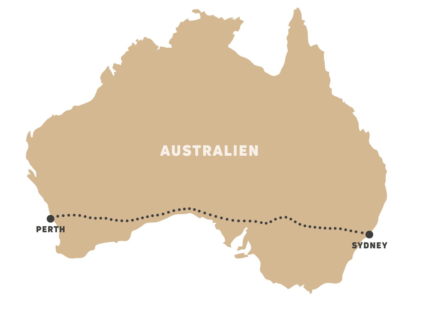 Die Strecke führte von Perth an der australischen Westküste nach Sydney im Osten. Der Start war am Cottesloe Beach. Der ein Kilometer lange weiße Sandstrand bei Perth ist ein Paradies zum Baden und Schnorcheln. Das Ziel erreichte Nedd Brockmann nach 47 Tagen am weltberühmten Bondi Beach, dem Surf-Mekka in Sydney. Dazwischen lagen 3953 Kilometer auf den Straßen durchs Outback.