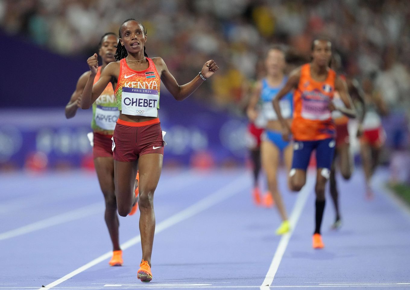 Während Tsegay zurückfiel, wurde die Kenianerin jedoch ihre Landsfrau Beatrice Chebet nicht los. Die Crosslauf-Weltmeisterin, die in dieser Saison auch schon einen sensationellen 10.000-m-Weltrekord gelaufen war (28:54,14), blieb Kipyegon auf den Fersen und griff dann eingangs der Zielgeraden selbst an. Rund 50 Meter vor dem Ziel überholte Beatrice Chebet ihre Landsfrau und lief bei ihrem ersten Olympia-Start auf Anhieb in 14:28,56 Minuten zur Goldmedaille. Faith Kipyegon wurde in 14:29,60 Zweite vor der holländischen Titelverteidigerin Sifan Hassan (14:30,61).