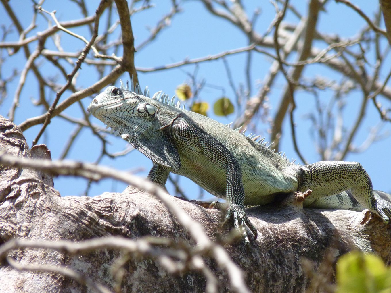 Ein spontaner Beobachtungshalt beschert dem neugierigen Reporter die spannende Begegnung mit einem fast halben Meter großen und gar nicht scheuen Riesenleguan! Circa 10 Meter von der Laufstrecke entfernt beobachtet er argwöhnisch die vorbeihechelnden Läufer und Läuferinnen. Als ich mich dem Prachtexemplar vorsichtig nähere, macht es sich aus dem Staub. Auf La Désirade gibt es schätzungsweise noch über 400 des vom Aussterben bedrohten Kleinen Antillen-Leguans. Der Zieleinlauf ist dann direkt wieder an unserem palmengesäumten Traumstrand.