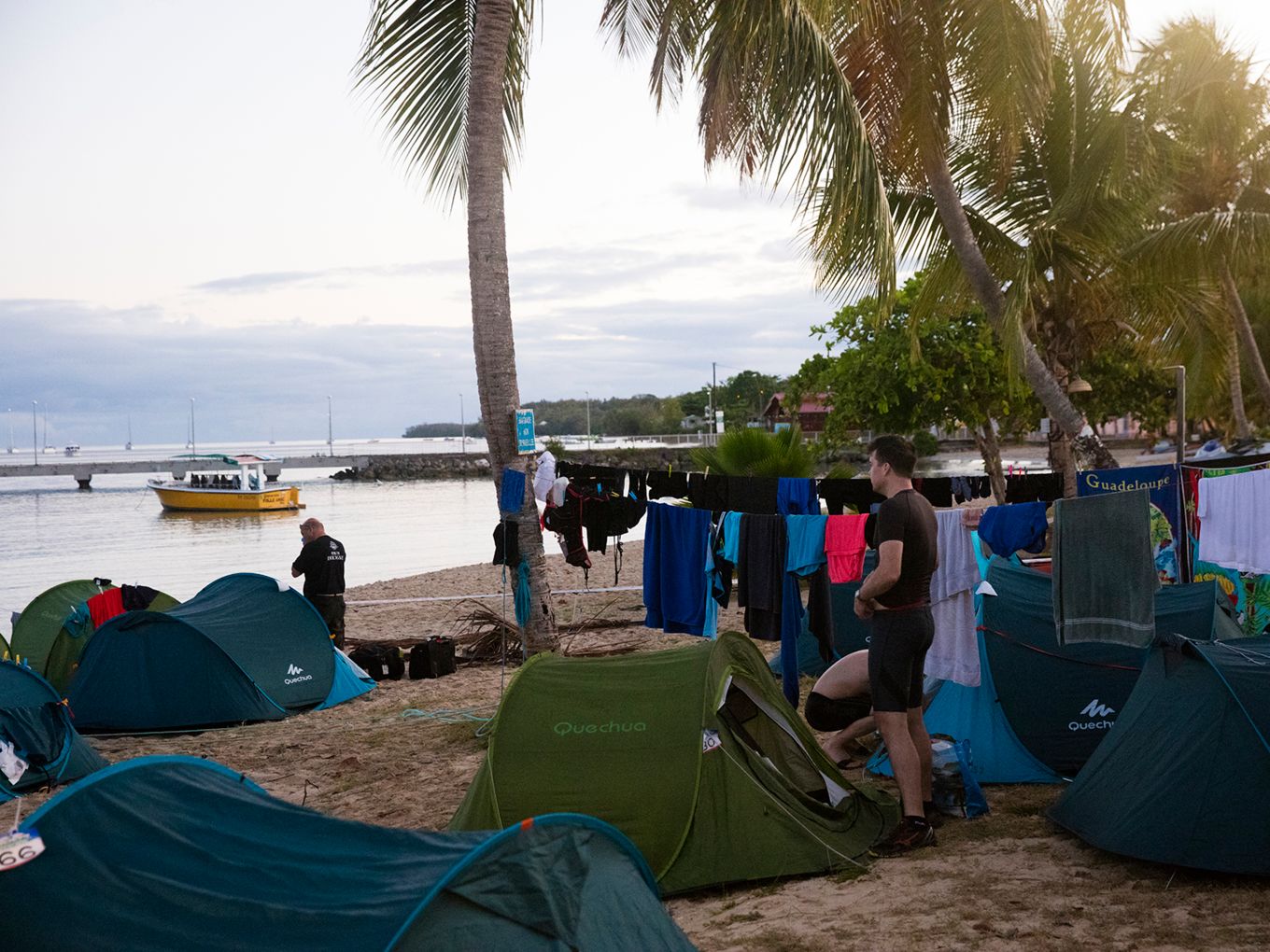 Und weiter geht es nach La Désirade, der östlichsten aller Satelliteninseln von Guadeloupe, die mit dem Katamaran in 90 Minuten erreicht wird. Von weitem erinnert die Form der 11 Kilometer langen, 2 Kilometer breiten und 273 Meter hohen Insel an den Rumpf eines umgekippten Schiffes. Am Plage à Fifi, direkt neben dem Hauptort Grande-Anse, wird unter Palmen das Camp aufgebaut.