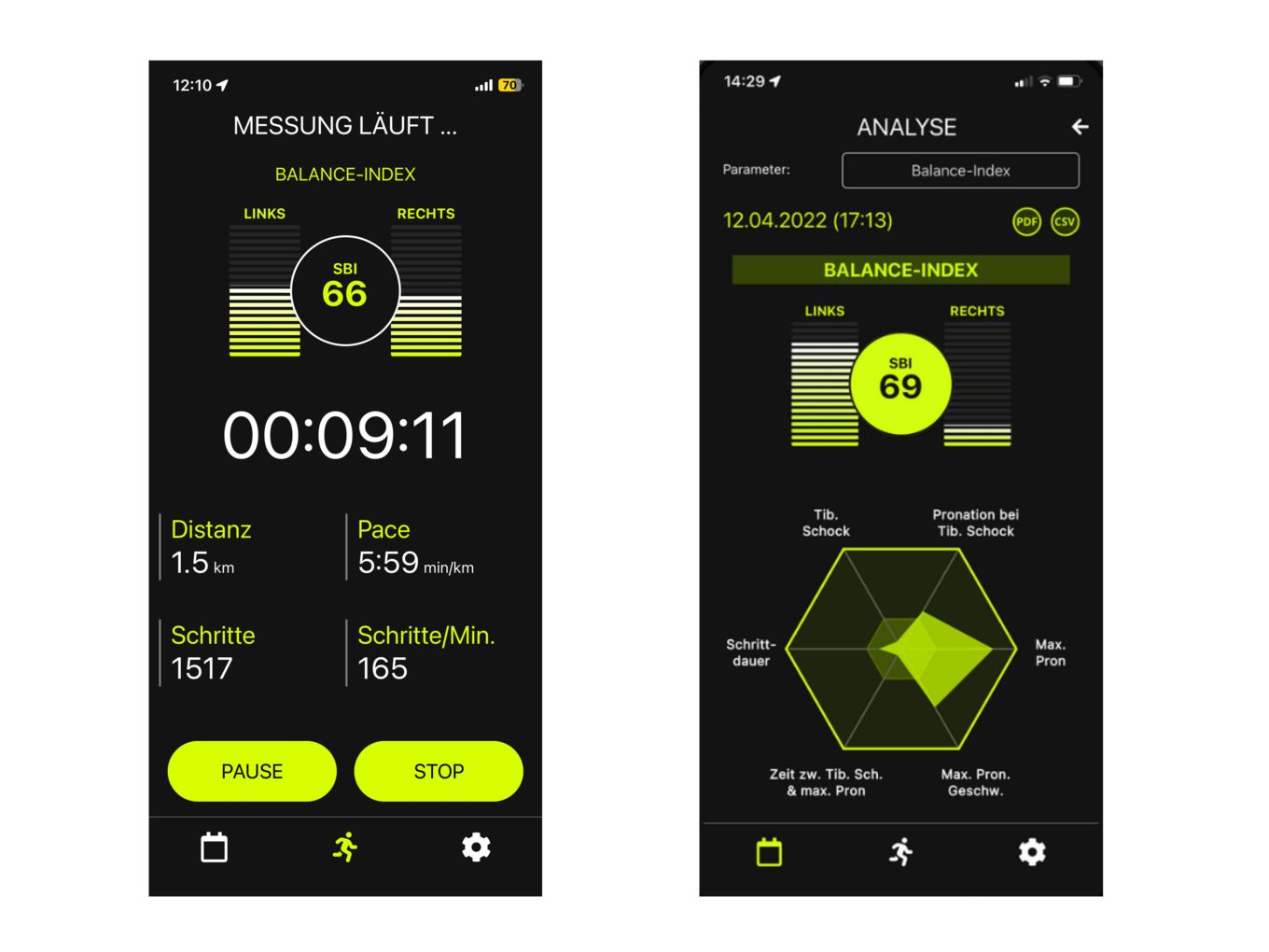 Die gemessenen Daten sind in Echtzeit verfolgbar und werden zur weiteren Analyse und Dokumentation gespeichert. Läuferinnen und Läufer können sich im Anschluss alle erfassten Daten grafisch aufbereitet anzeigen lassen und mit Hilfe eines einzigen Wertes die Balance ihres Laufes sehen: Der SBI (SensoRun Balance Index) beinhaltet den Links-Rechts-Vergleich aller laufrelevanter Bewegungs- und Stoßbelastungsparameter und rechnet diese in einen Wert von 0 bis 100 um. Dysbalancen können damit in der App einfach und schnell erkannt werden.