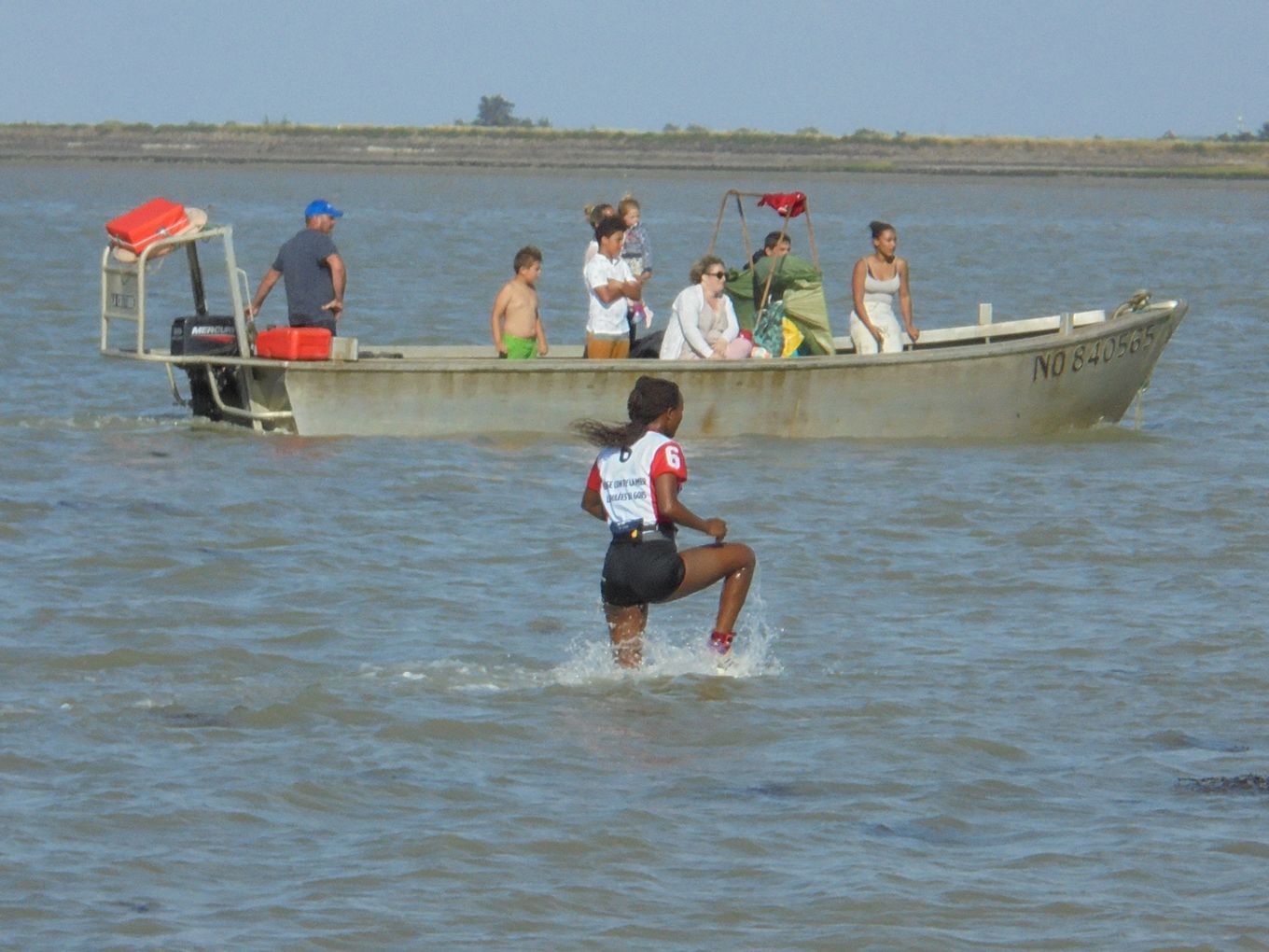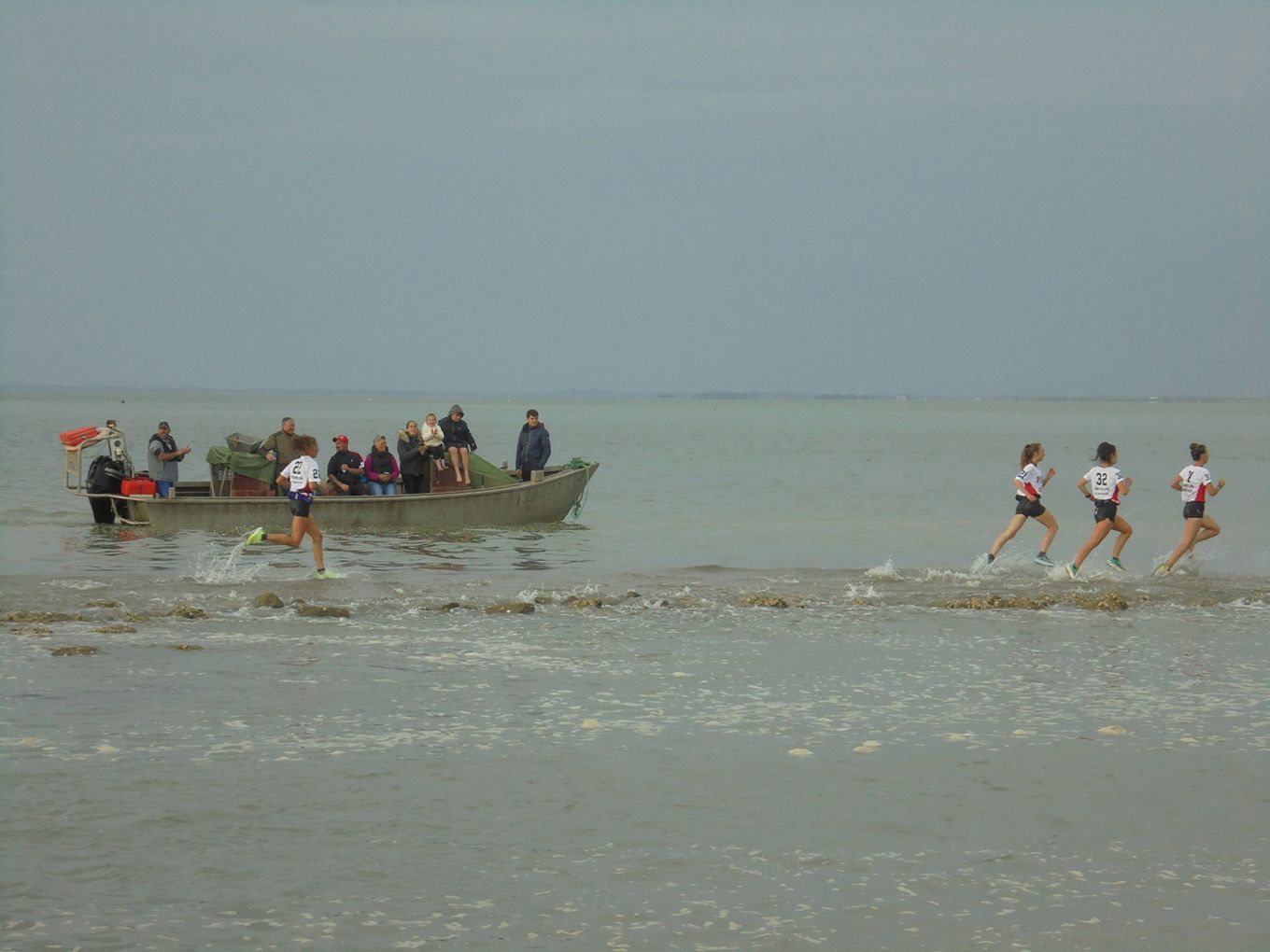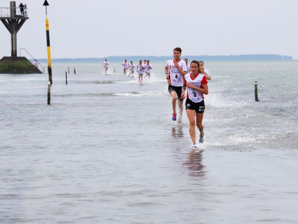 Auftakt war bereits um 15:15 Uhr das Einladungsrennen, bei dem die lokale Elite mit elf Läuferinnen und 25 Läufern in die ablaufende Flut gejagt wurden. Vier Kilometer im noch knietiefen Wasser bis zur Insel sorgen für die ersten spektakulären Szenen des Tages. Nach dem Wendepunkt ist das Wasser dann schon fast komplett abgelaufen, so dass wieder Speed aufgenommen werden kann und die Siegerzeiten noch immer passable Werte von 28:21 Minuten (erster Mann) und 34:43 Minuten (erste Dame) für das acht Kilometer lange „Wasser-Hindernisrennen“ erreicht werden.