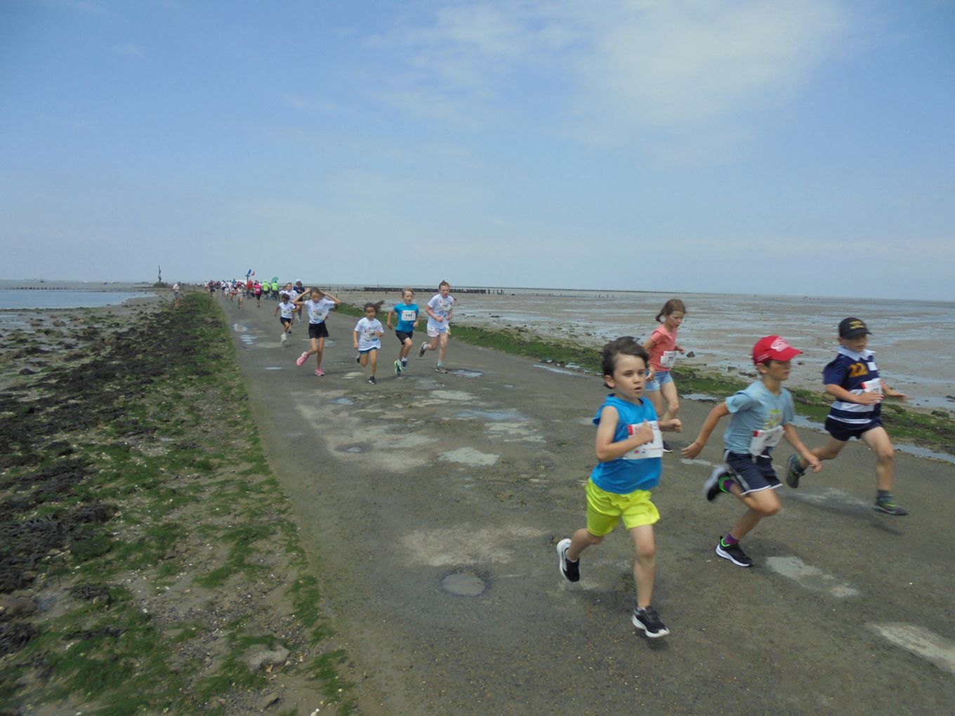17:52 Uhr – Niedrigwasser. Die Volksläufe sind in vollem Gange. 898 Männer und 894 Frauen laufen in getrennten Startgruppen den Gois vor und zurück, insgesamt acht Kilometer. Zuvor waren schon die Kinder und Jugendlichen mit Strecken über 900 bzw. 2400 Meter dran. Dazwischen noch ein Acht-Kilometer-Rennen für Behinderte, dabei auch ein Dutzend Joëlettes – Einrad-Geländerollstühle –, in denen behinderte Kinder von mehreren Läuferinnen und Läufern transportiert werden, und ein paar Handbiker.