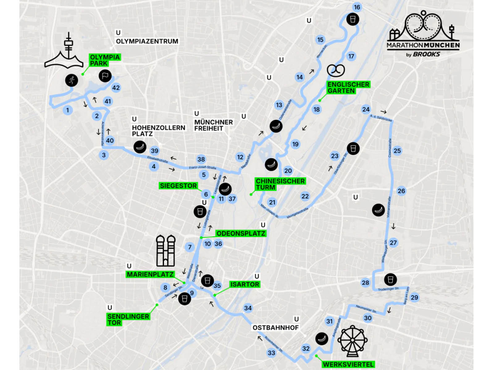 Die neu gestaltete Marathonstrecke beginnt und endet im traditionsreichen Olympiapark und führt an vielen bekannten Sehenswürdigkeiten der Stadt vorbei. Unterwegs passieren die Läufer Highlights wie das Siegestor, das Sendlinger Tor, das Isartor, den Marienplatz, den Englischen Garten und das Werksviertel. Gerade das Sendlinger Tor und das Werksviertel sind neue Stationen auf der Strecke.