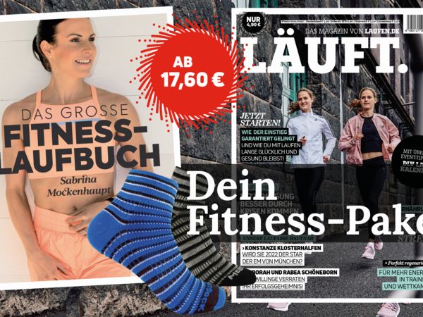 Du willst das Buch UND die Laufsocken zum Magazin haben? Kein Problem. Bestelle einfach direkt dein acht Ausgaben umfassendes digitales Jahres-Abo für 35,20 Euro und du erhältst umgehend dein großes Fitness-Paket mit Buch und Socken im Wert von 41,85 Euro. Wer dazu auch die acht gedruckten Ausgaben im Briefkasten will, erhält sein Print-Abo mit Laufbuch und Socken schon für 41,80 Euro.