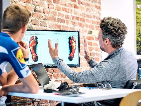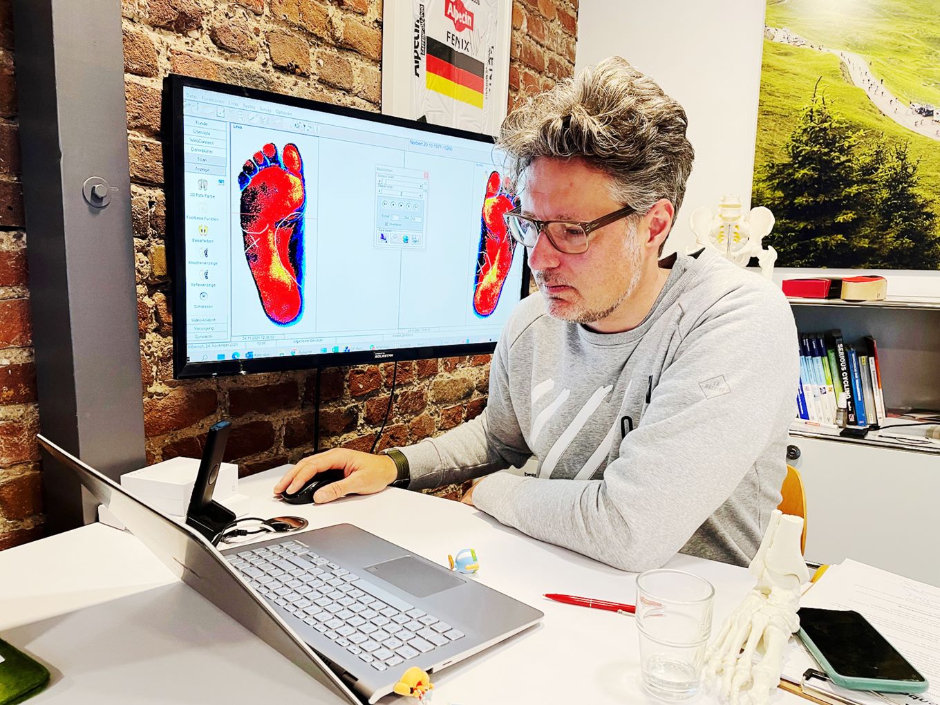 Ich stehe also Oliver Elsenbach gegenüber. Er macht einen Fußabdruck auf einem Scanner. „Das ist für mich viel aussagekräftiger als eine Druckmessplatte“, sagt der 51-Jährige. Er betrachtet, wo ich Hornhaut an den Füßen bilde und wo meine Füße belastet sind. Dann misst er die Spannung meiner Beine, drückt sie durch, betrachtet meine Drehung im Hüftgelenk, wenn ich den Oberkörper vorbeuge und sieht den Zusammenhang zwischen Kniebeugung bzw. -streckung und der Rotation im Becken.