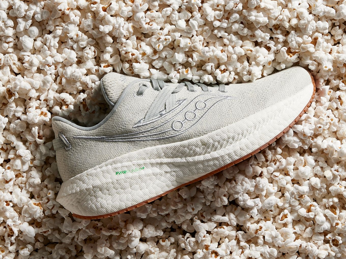 Der Triumph RFG von Saucony verfügt über eine Zwischensohle, die zum Großteil aus einem Material besteht, das nicht auf Erdöl- sondern auf Maisbasis gewonnen wird. Saucony nennt den neuen Dämpfungsschaum PWRRUN Bio. Die Mittelsohle des Triumph RFG besteht zu 55 Prozent aus diesem Stoff. Um aus Mais allerdings Dämpfungsschaum zu machen, sind komplexe chemische Prozesse nötig, die mit der Umwandlung von Mais in Popcorn nur sehr wenig gemein haben.