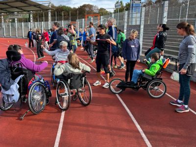 Der Hauptblock besteht aus dem gemeinsamen Laufen. Dadurch, dass im Stadion gelaufen, gegangen und gerollt wird, entsteht eine gemeinsame Trainingsstimmung. „Man sieht sich auf der Bahn, auch wenn man auf unterschiedliche Weise und in unterschiedlichem Tempo unterwegs ist.“ Der Abschluss jeder Einheit gehört dem Austausch – der kleine Verpflegungsstand, der vom lokalen Supermarkt versorgt und von treuen Unterstützerinnen betreut wird, lädt nach dem Training zum Verweilen und zum Gespräch ein. Für Marc Suhrcke und sein Kernteam ist der inklusive Lauftreff weit mehr als ein Sportangebot. Er ist eine Vernetzungsmöglichkeit, ein Beitrag zur sozialen Inklusion.