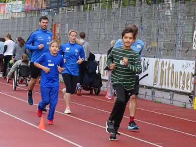 Der Kern des Trainings dauert etwa eine Stunde und beginnt immer mit einer gemeinsamen Begrüßung. Danach geht es ans Traben, Dehnen und ans Lauf-ABC. „Nicht alle Menschen, die zu uns kommen, können dieselben Übungen absolvieren“, erklärt Marc Suhrcke. „Dann bilden sich kleine Gruppen, die sich so aufwärmen und dehnen, wie es für ihre Möglichkeiten am besten ist.“