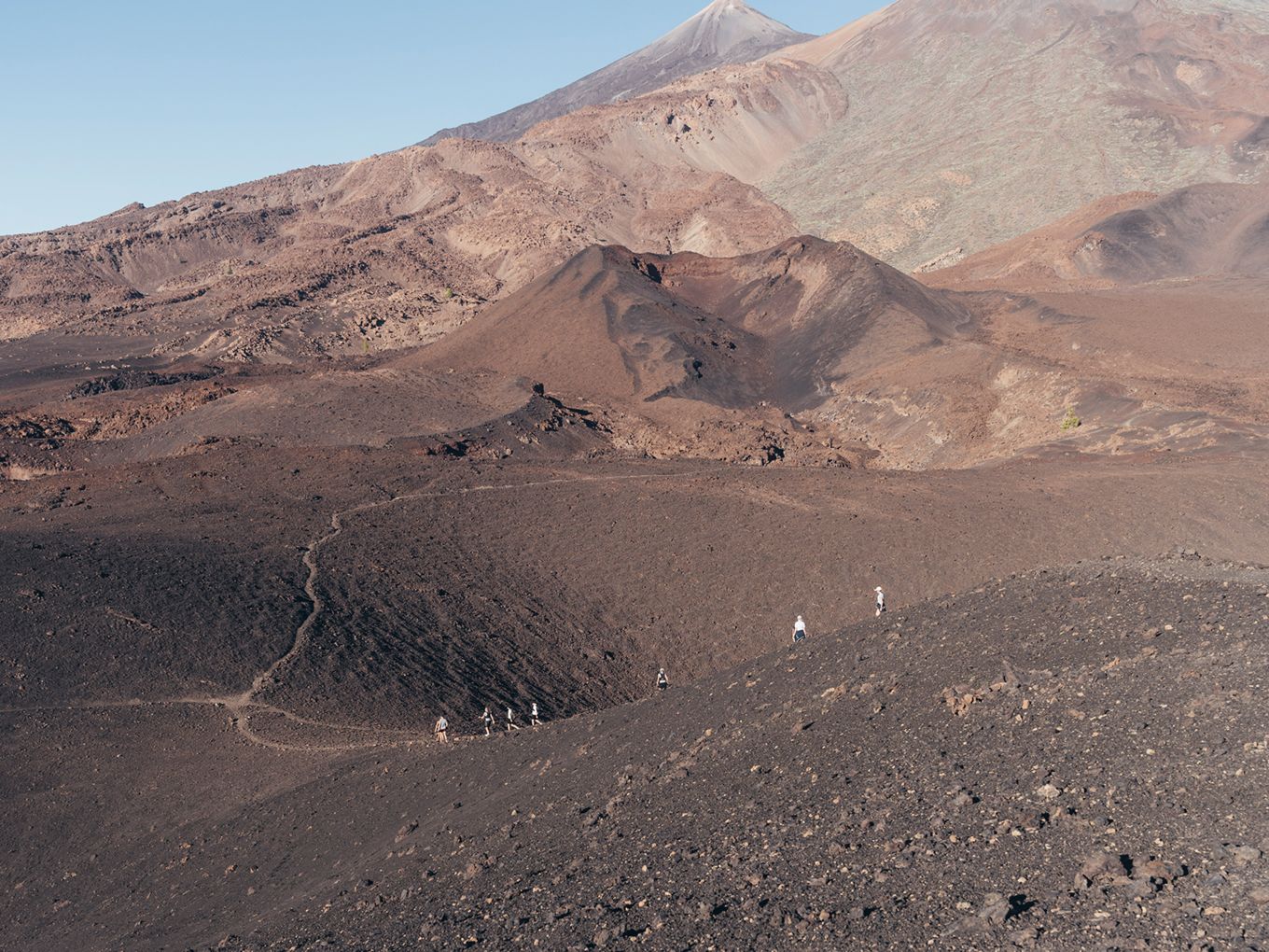 In unmittelbarer Nähe des Teide befinden sich einige kleine, geologisch junge Vulkane. Wir laufen in der weiten Lavalandschaft des Montaña Sámara auf etwa 2000 Metern Höhe. Mit jedem Schritt wirbelt feiner Staub auf. Der Abstecher zum Gipfel ist kurz, aber teilweise steil auf losen Lavasteinchen. Der Blick von dort oben reicht bis nach La Palma.