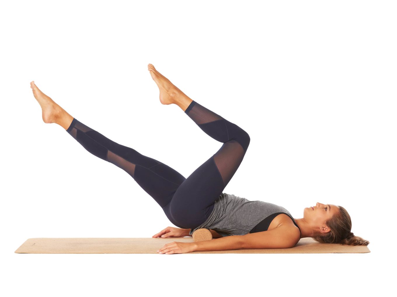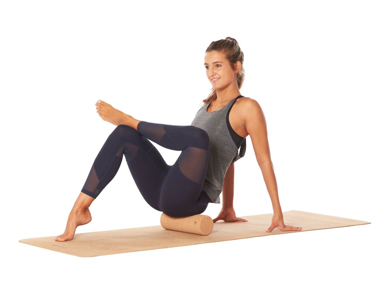 Lege dich auf den Rücken und platziere die Korkrolle unter dem Gesäß. Ziehe ein Knie mit beiden Händen Richtung Bauch. Das andere Bein bleibt lang gestreckt, der Fuß liegt auf dem Boden, sodass eine Dehnung in der Hüfte zu spüren ist. Wechsele danach das Bein.