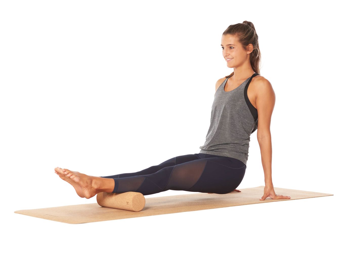 Lege der im Sitzen die Korkrolle unter die Waden, kurz über den Fersen. Stütze dich mit den Armen nach hinten ab und hebe dein Gesäß. Rolle nun langsam die Waden in Richtung der Kniekehlen aus. Beim Wiederholen erneut an der Ferse starten.