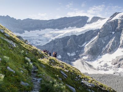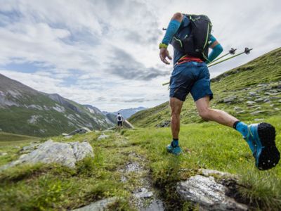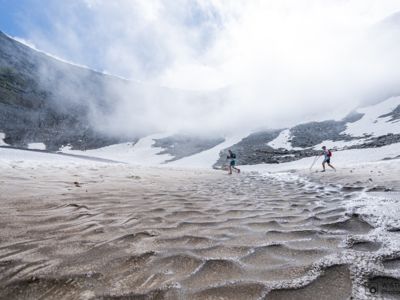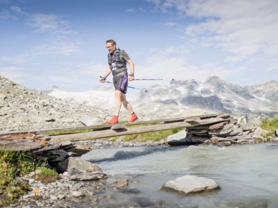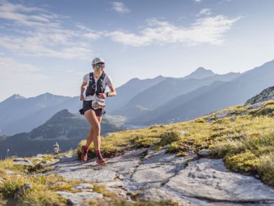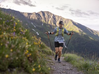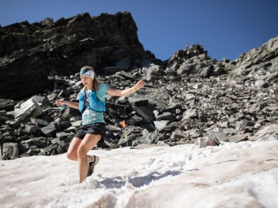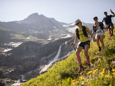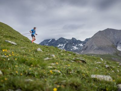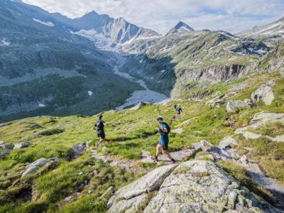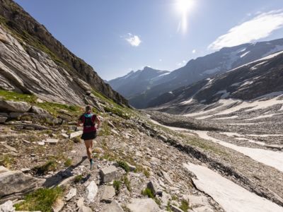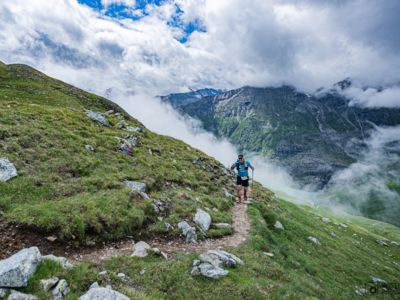 Dass ich tatsächlich fit genug bin, merke ich auf den ersten fast 1000 Höhenmetern bergauf. Die führen vom Enzingerboden, der Talstation der Seilbahn, mit der auch normale Touristen den Gletschern im Nationalpark Hohe Tauern nahekommen können, zur Mittelstation an der Rudolfshütte. Es ist zu steil zum Laufen, aber mit schnellen Gehschritten komme ich gut voran. Sobald es flacher wird, fühlt sich das Laufen über die Almhochflächen zu Füßen der Bergriesen wie Fliegen an. In diesem Hochgefühl komme ich schon nach einer guten Stunde gemeinsam mit vielen erfahrenen Trailrunnern an der Rudolfshütte an, wo die erste Verpflegungsstation eingerichtet ist.