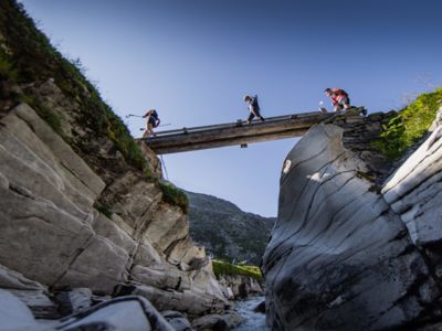 Irgendwie muss ich den zweiten Ratschlag verdrängen, den mir Rosanna Buchauer gegeben hatte: „Schnelle Downhills im Hochgebirge schafft man nur, wenn man das nicht nur übt, sondern auch mit dem übrigen Training unterstützt. Krafttraining gehört auf jeden Fall dazu. Aber am wichtigsten ist es, das Bergablaufen langsam zu steigern, sonst kann es zum Problem für die Knie werden.“ Geübt habe ich das nur einmal im Sommerurlaub im Bayerischen Wald, aber das ist mit dem Hochgebirge nicht zu vergleichen. Das bisschen Krafttraining daheim rettet mich jetzt auch nicht. Und zum langsam Steigern ist es längst zu spät. Nach den ersten 400 Höhenmetern steil bergab warten noch gut 1800 weitere auf mich, bis ich wieder in Kaprun bin, wo auf 800 Metern über dem Meer das Ziel ist.